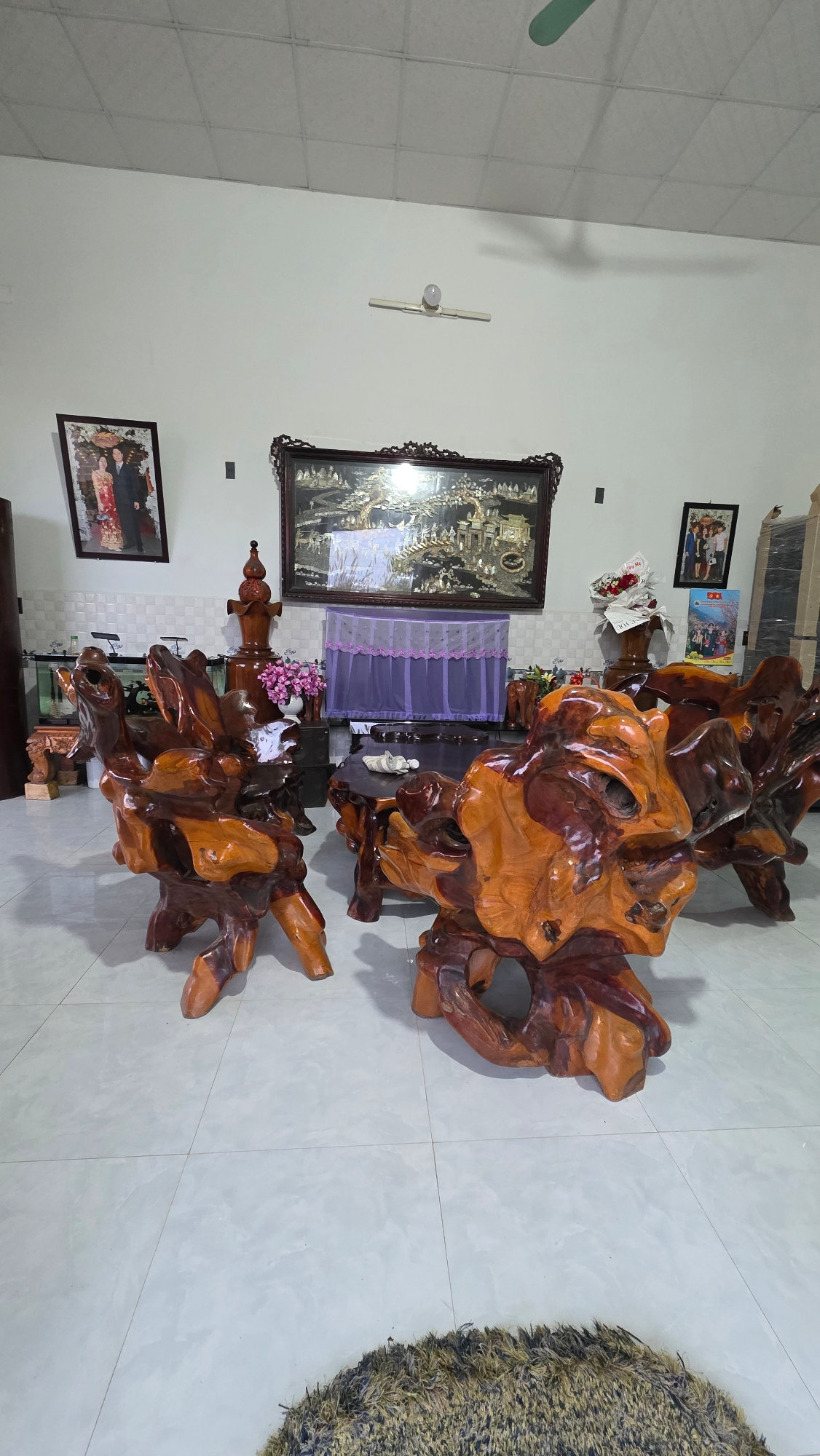 The image depicts a living room interior in what appears to be a home in Bờ Y, Vietnam. The room features light-colored tile flooring. Dominating the scene are two large, sculptural pieces of furnitur…read more