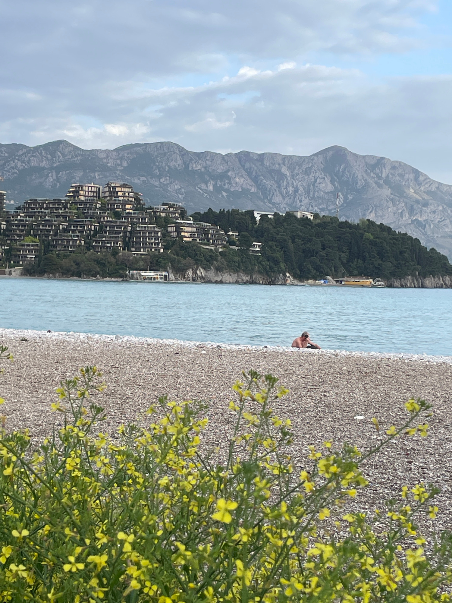 This landscape photo depicts a shoreline view in Budva, Montenegro. The image is vertically oriented. In the foreground, a bush with small yellow flowers grows on a stony beach. The beach slopes into…read more