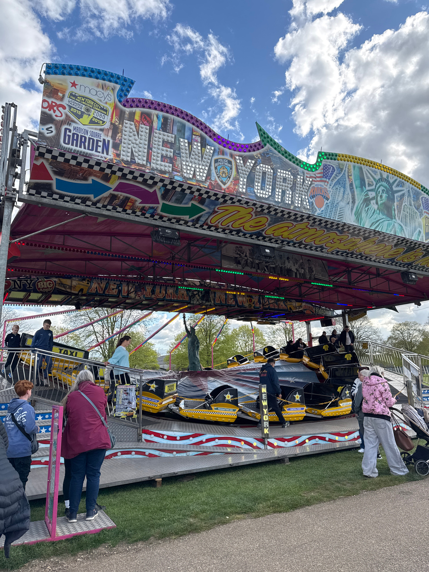 The image shows a fairground ride with a New York theme. The ride is adorned with images of the Statue of Liberty, Times Square, and other New York landmarks. The carriages of the ride are designed to…read more