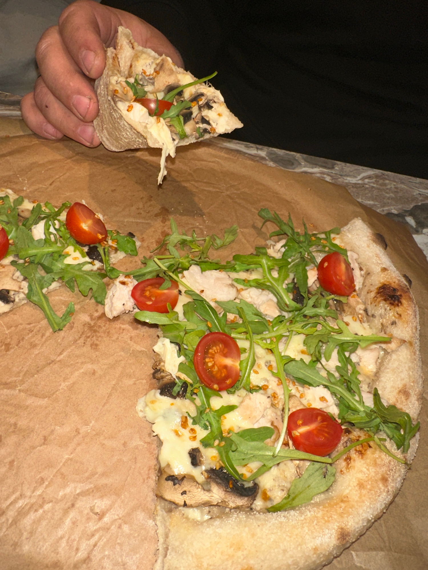 A close-up shot shows a partially eaten pizza on brown parchment paper. A hand holds a single slice, pulled away from the main pizza. The pizza appears to be topped with cheese, sliced cherry tomatoes…read more