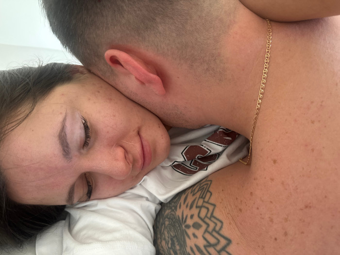 An indoor scene in Karon, Thailand, depicts two individuals in close physical contact. A female subject is positioned on her right side, with her eyes closed, resting on a white pillow. Her face exhib…read more
