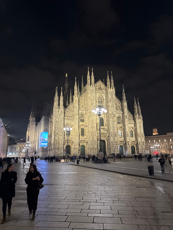 The image depicts an illuminated nighttime scene in Piazza del Duomo, Milan, Italy. The central and dominant feature is the brightly lit Milan Cathedral (Duomo di Milano), showcasing its Gothic archit…read more