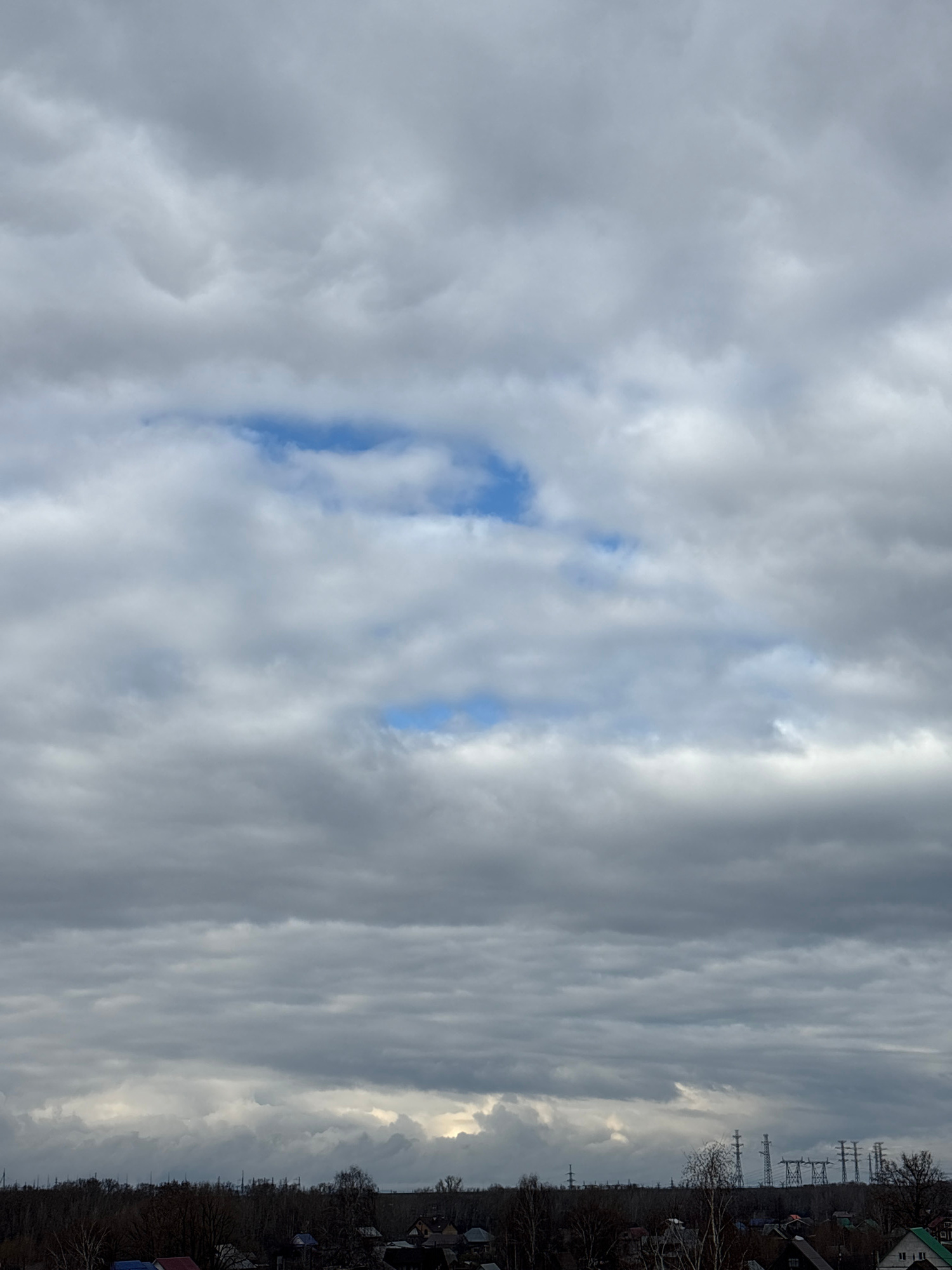 The image displays a sky dominated by a large expanse of clouds, with a distant horizon line visible at the bottom (when viewed in correct orientation). The clouds are primarily shades of grey and whi…read more