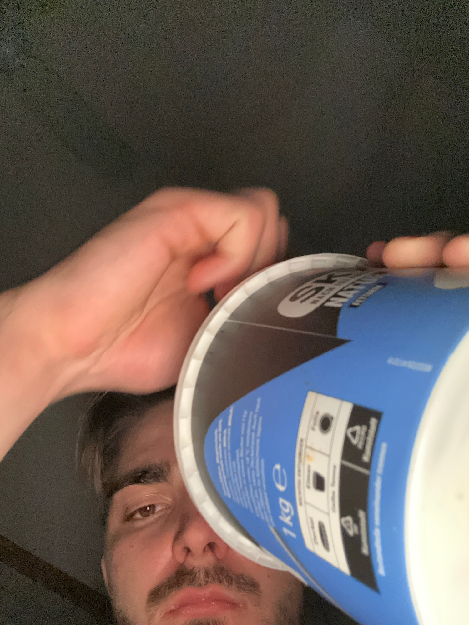 A man holds a blue and white container in front of his face. The container appears to be a 1 kg product, with recycling symbols visible on the side. The man has brown eyes, dark hair, and a mustache.…read more
