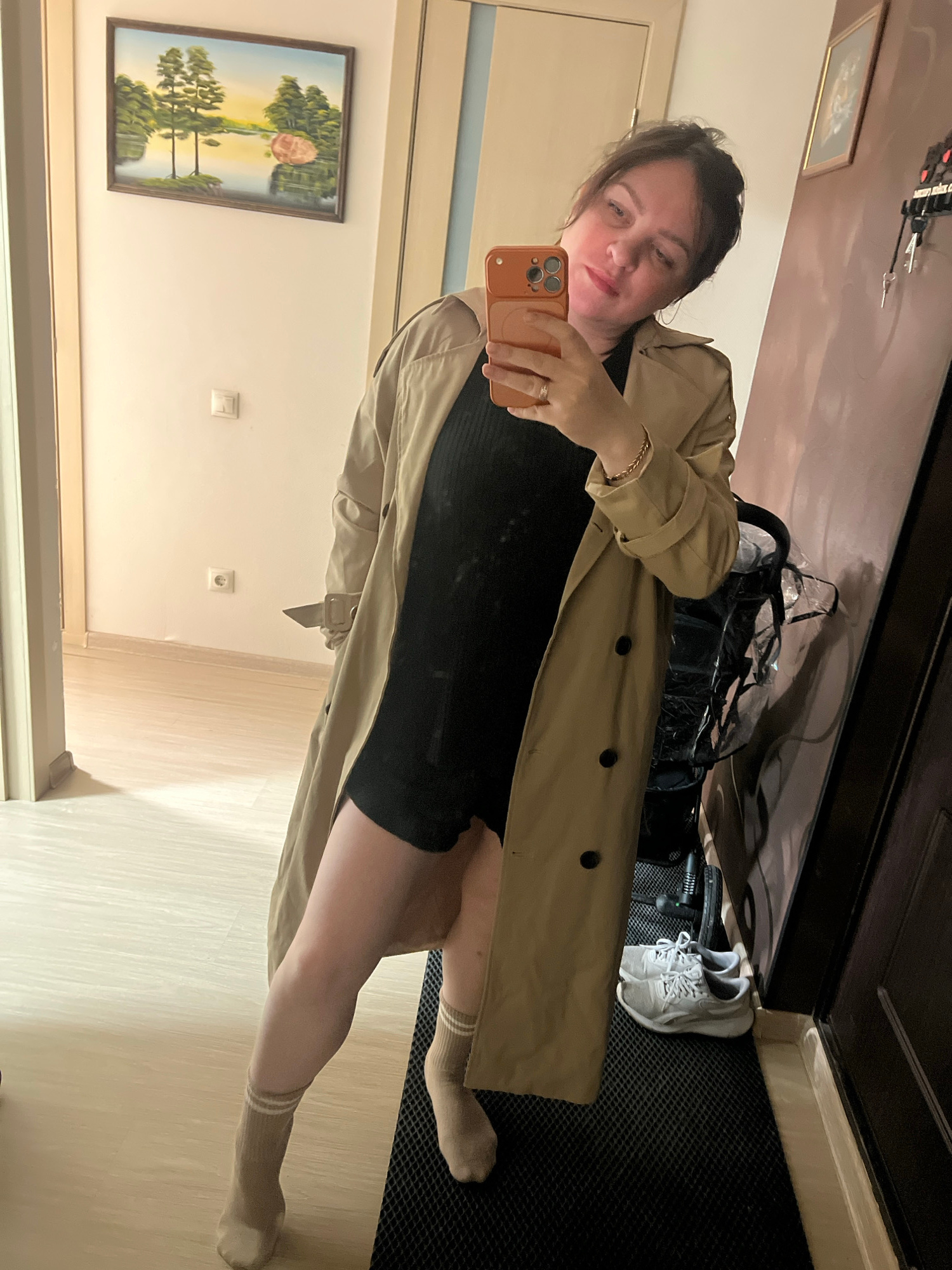 A woman is taking a selfie in what appears to be an apartment or house interior. She is wearing a black dress, a beige trench coat, and striped socks. Her right hand is holding an orange phone. In th…read more