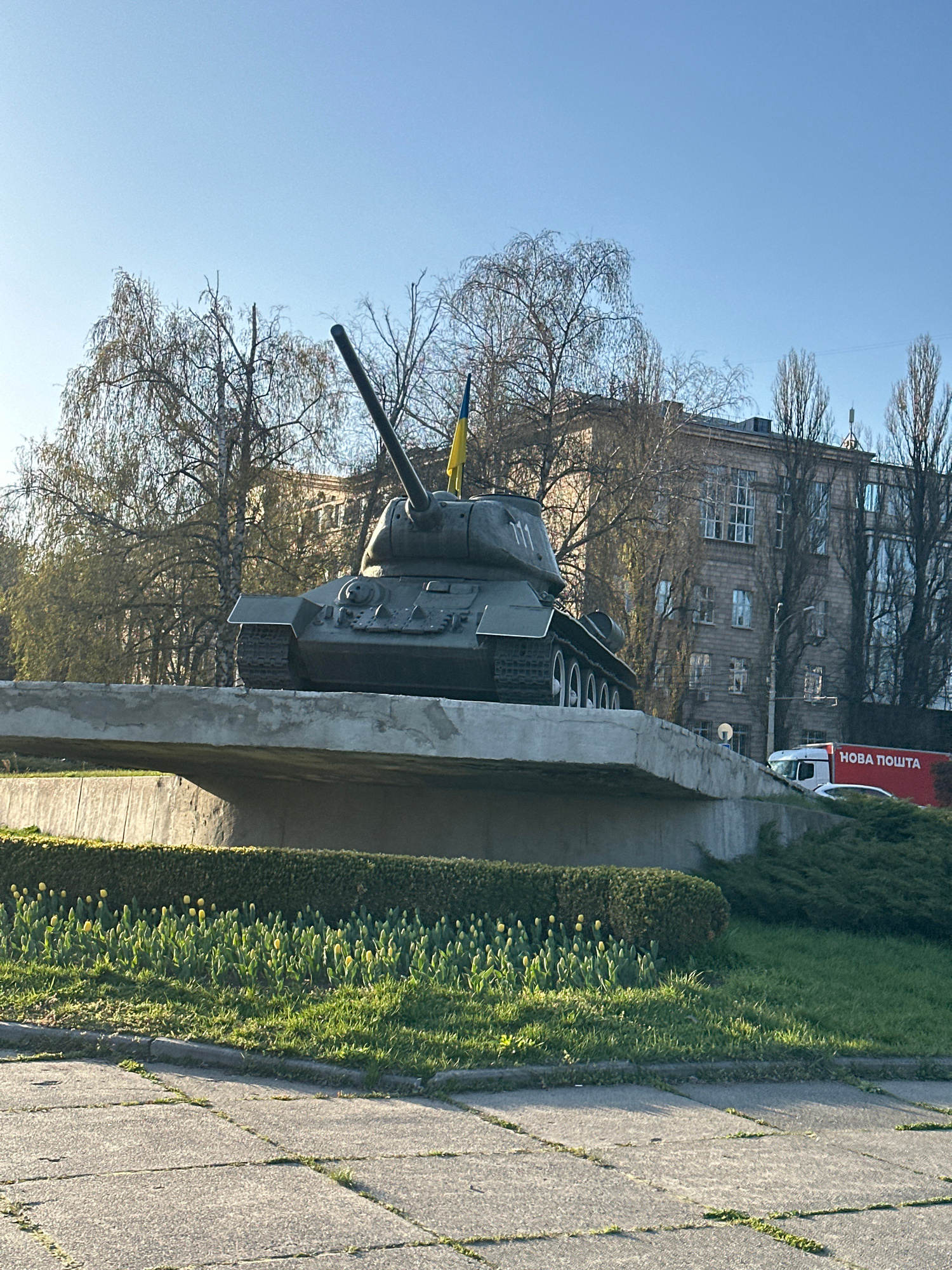The image depicts a T-34 tank mounted on a concrete plinth in Kyiv, Ukraine. A Ukrainian flag is visible on the tank. Behind the tank is a multi-story building, and a white Nova Poshta (Ukrainian post…read more