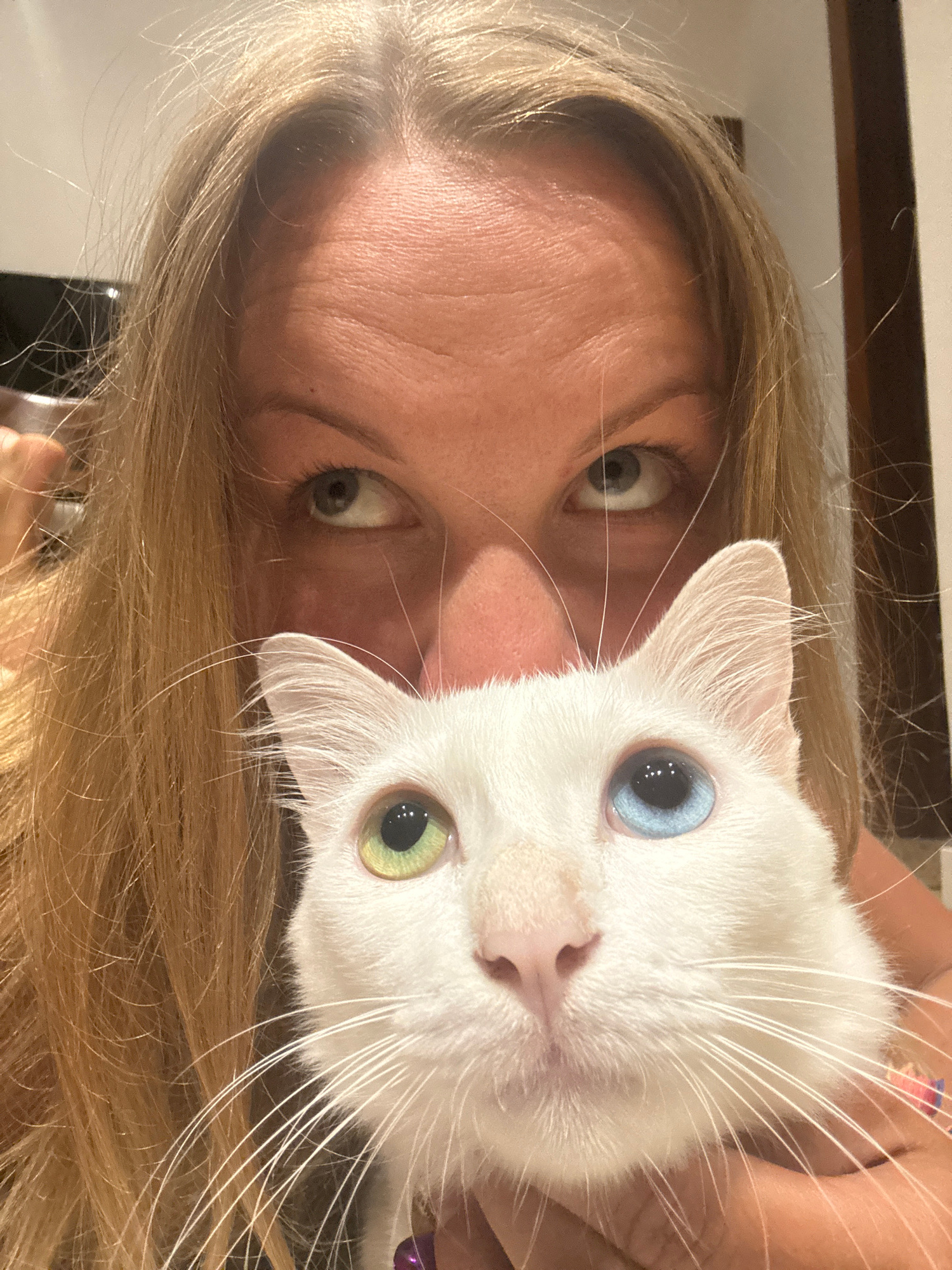 A woman with blonde hair is holding a white cat with heterochromia (one blue eye and one green eye) close to her face. The woman's eyes are visible above the cat. The setting appears to be indoors. Th…read more