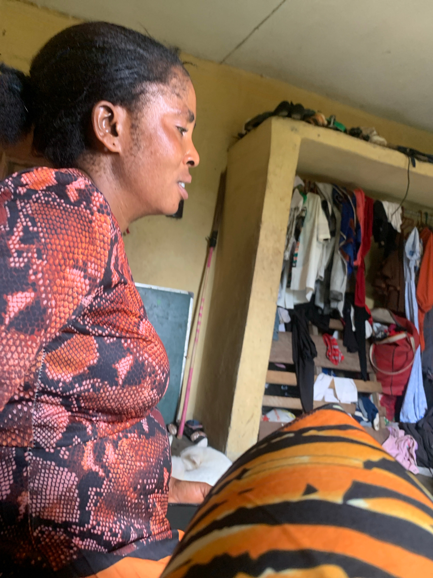 The image shows a person lying down indoors with their head tilted back. They are wearing a snakeskin-patterned shirt and a striped orange and black garment. The environment appears to be a cluttered…read more
