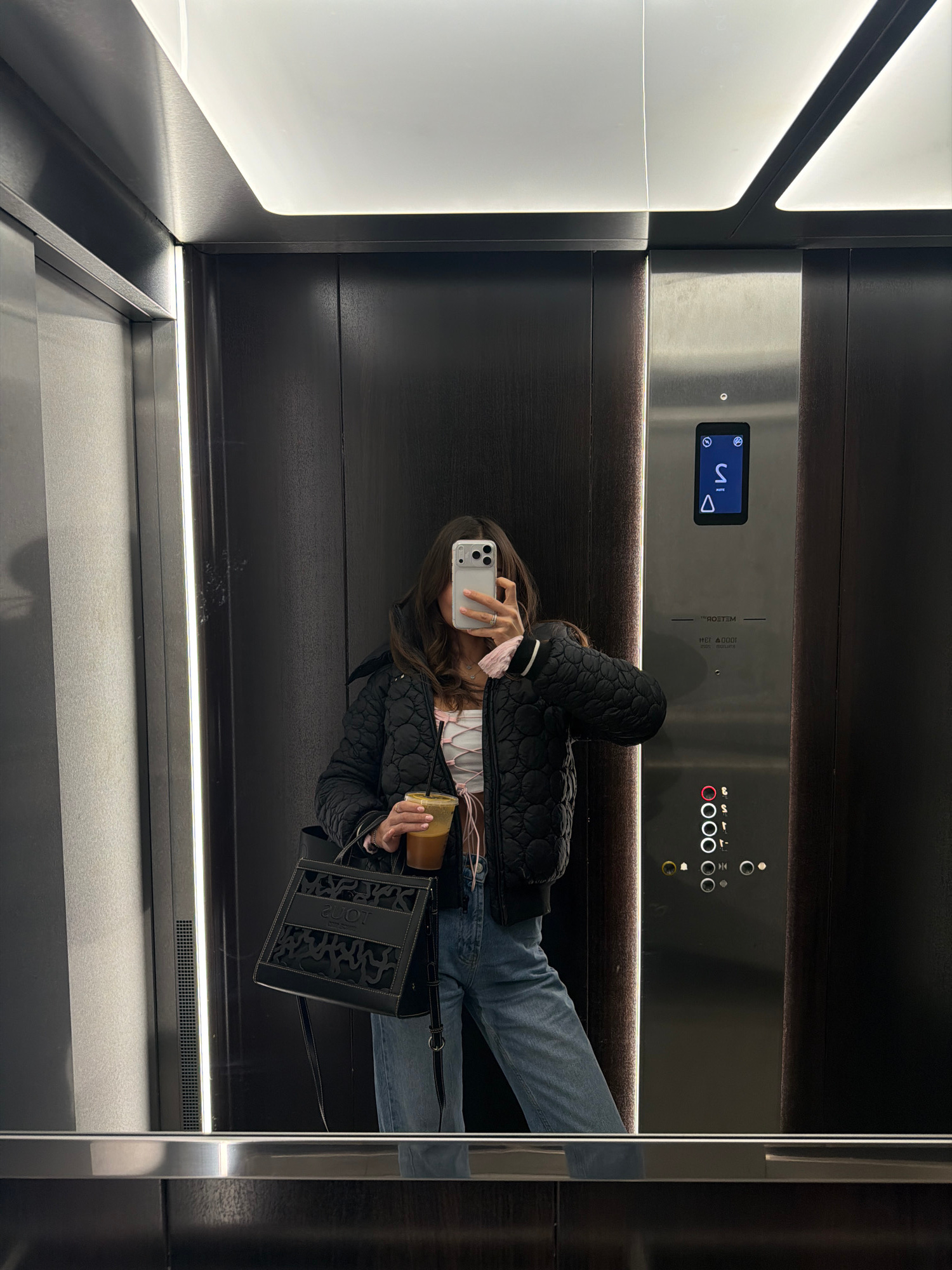 A person is captured in a mirror selfie inside a modern elevator, facing the reflective door. The subject, likely female, wears a black quilted jacket over a light pink top and blue jeans. Her face is…read more