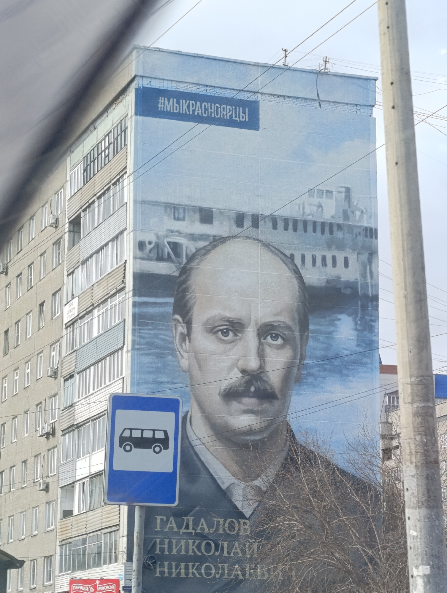 The image captures an urban street scene in Krasnoyarsk, Russia, dominated by a large mural painted on the side of a tall building. The mural features a detailed portrait of a man with a mustache, loo…read more