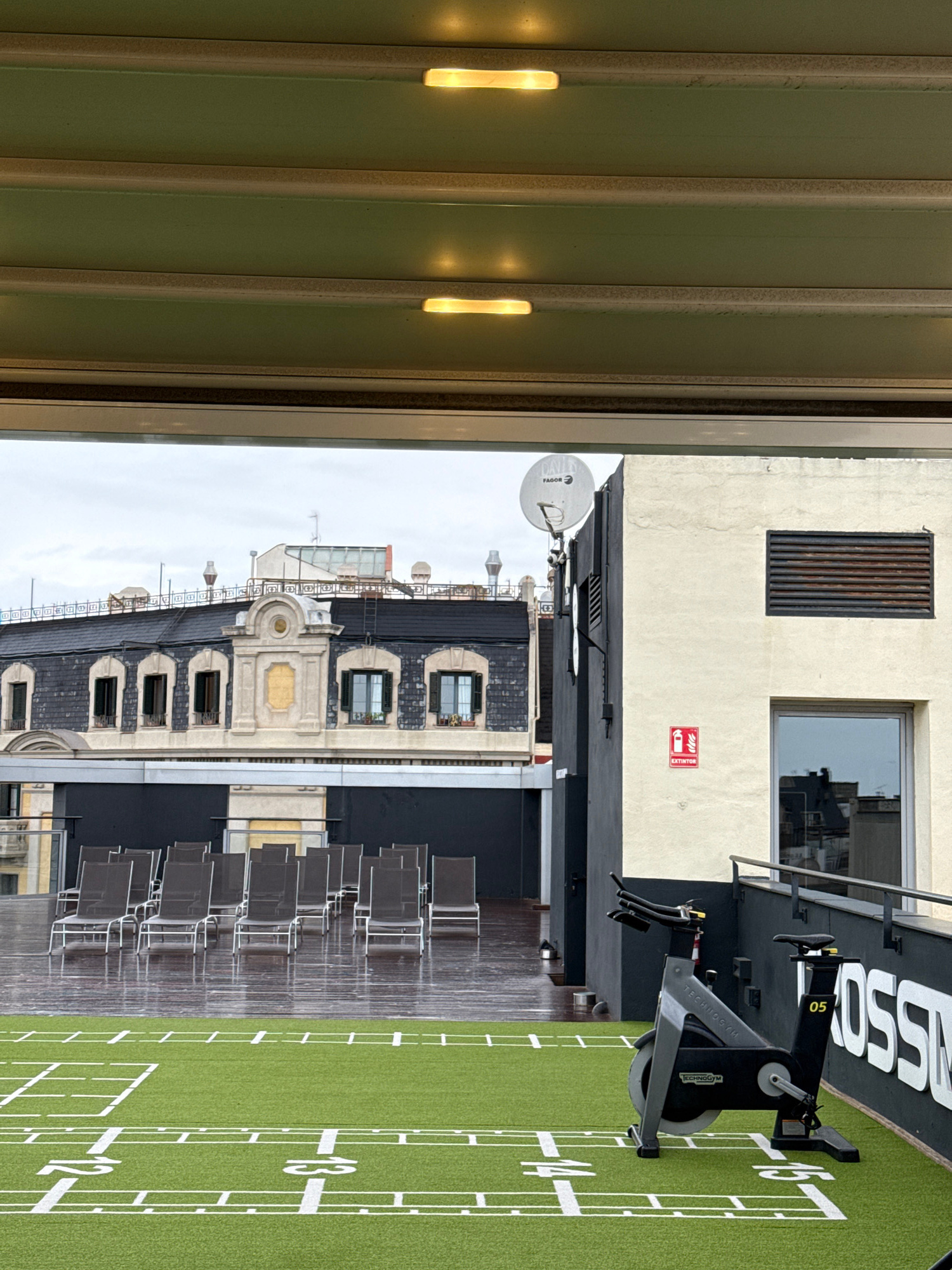 The photograph shows a rooftop scene in Barcelona, Spain. A portion of a building with a beige facade, windows, and a ventilation grill is visible, along with rooftops of adjacent buildings under a cl…read more