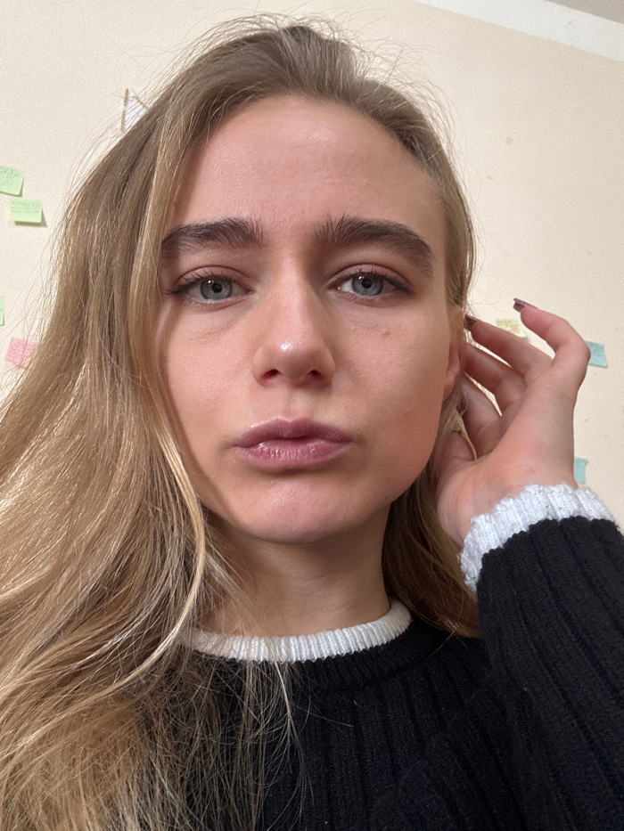The image captures a frontal, chest-up portrait of an adult female subject indoors, located in the city of Unknown, Unknown. She possesses long, wavy blonde hair, blue eyes, and light complexion. The…read more