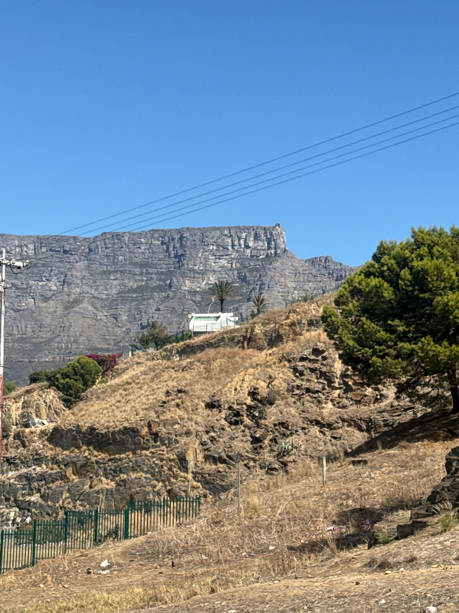 The image depicts Table Mountain in Cape Town, South Africa, under a clear blue sky. In the foreground, there is a rocky hillside covered in dry vegetation and interspersed with some greenery. The mou…read more