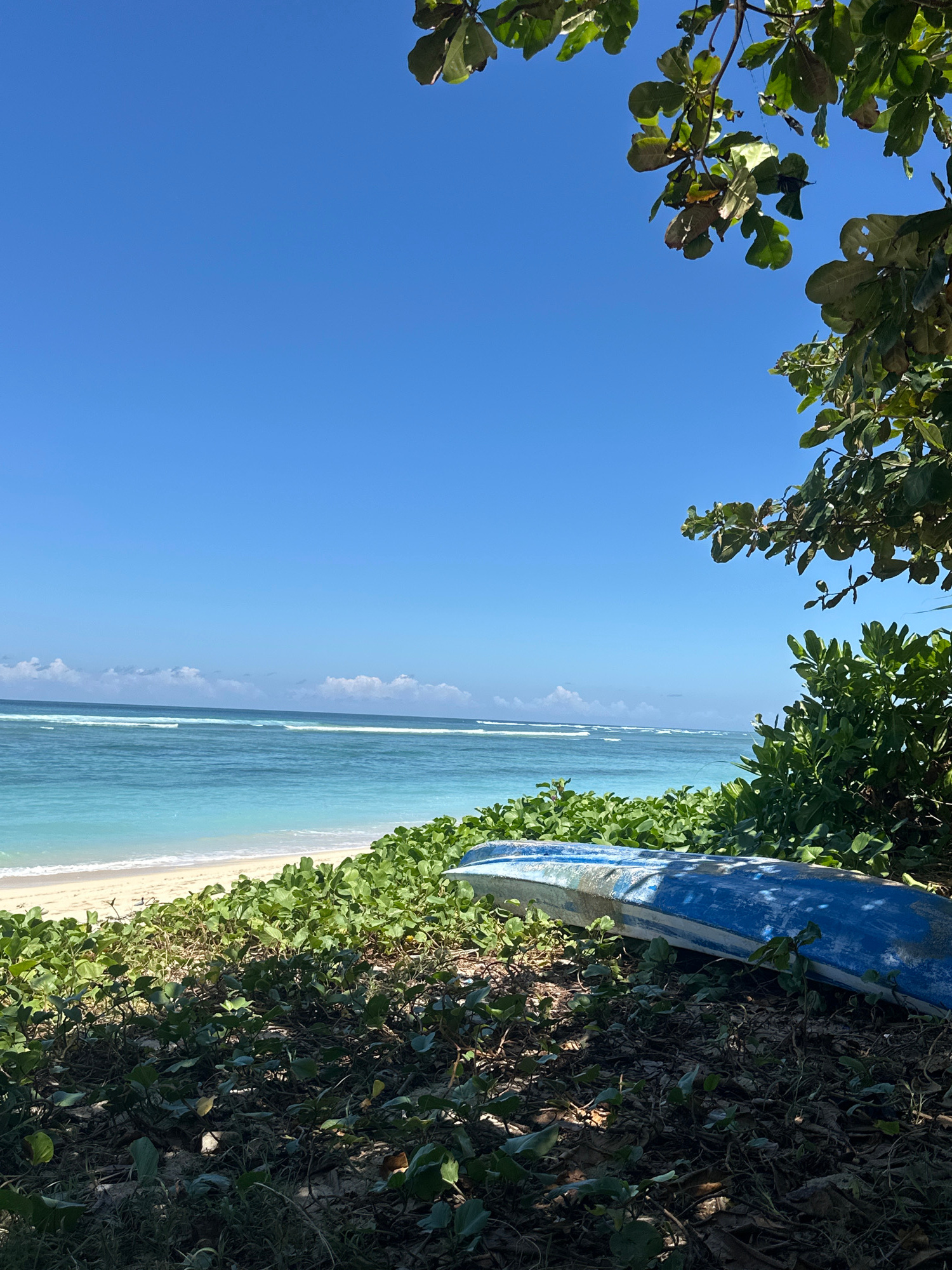 This image captures a vibrant, sunlit tropical beach scene, likely viewed from behind some coastal vegetation. The clear, bright blue sky dominates the upper left portion of the frame, suggesting a su…read more