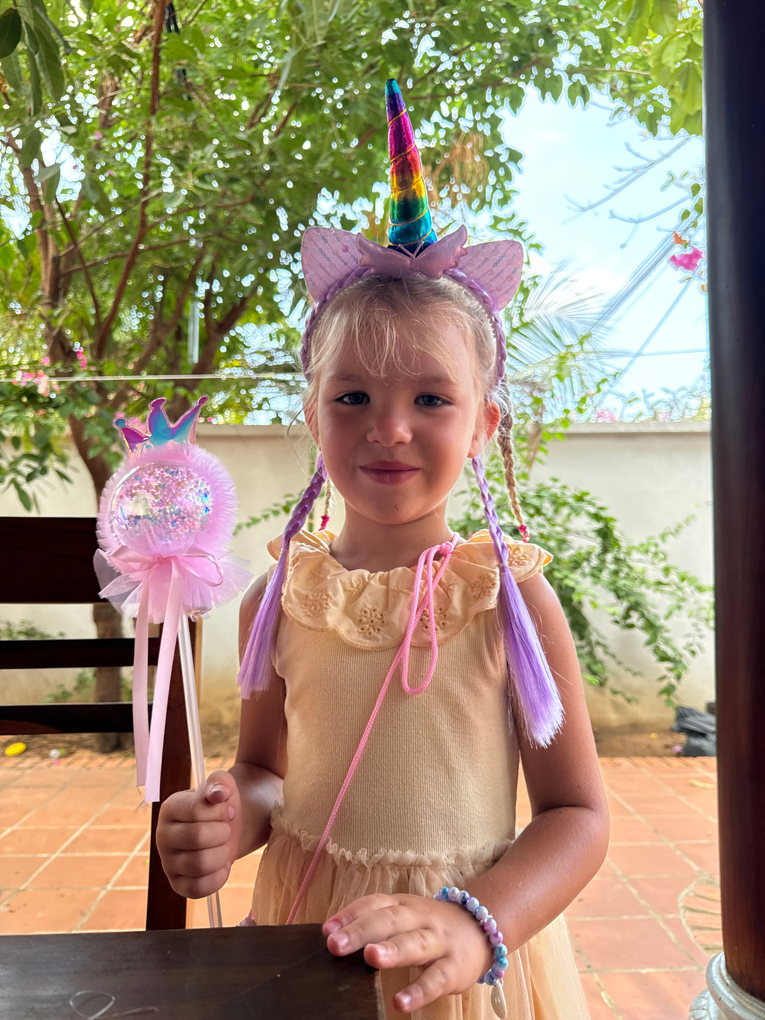 A young girl, likely a toddler or preschooler, is depicted in an outdoor, brightly lit setting. She has light blonde hair, blue eyes, and a gentle smile directed towards the viewer. She is wearing a light peach or beige dress with delicate ruffle detailing and a visible pink string on the bodice. Her attire is distinctly fantastical; she sports a unicorn headband with shiny purple ears and a vibrant rainbow-colored horn. Complementing this, she has braided hair extensions in a soft purple hue, some with light-colored wraps, that stand out against her blonde hair and rest on her shoulders. On her right wrist, she wears a bracelet composed of marbled blue and pink beads, with a small white charm attached. In her right hand, she holds a whimsical pink and glittery magic wand. The wand features a clear, sphere-like top filled with sparkling confetti and a small crown motif, adorned with pink ribbons and tulle. The background suggests a lush, natural environment, likely a garden or patio. Green foliage from trees and climbing plants is visible, creating a vibrant backdrop under a bright, sunny sky. Parts of a terracotta-tiled ground or wall are also discernible, along with a dark wooden beam or frame in the foreground, indicating an outdoor structure. The image appears to be taken in Mũi Né, Vietnam, under clear, daytime conditions. No visible text is present in the image. | Open Wire
