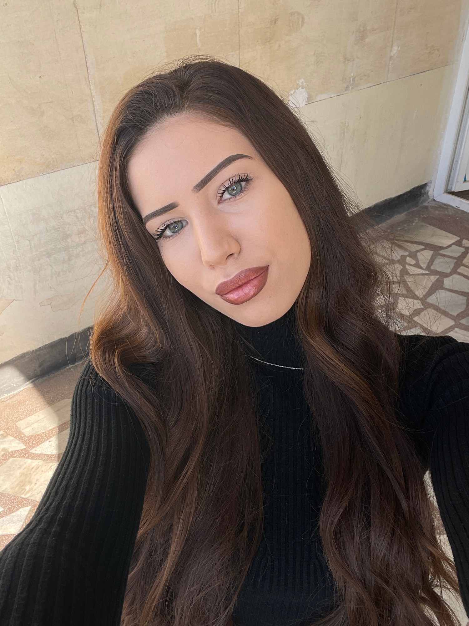A close-up, rotated perspective shot of a young woman with long, brown wavy hair and fair skin. She has light-colored eyes, defined eyebrows, and is wearing lip makeup. The woman is wearing a black tu…read more