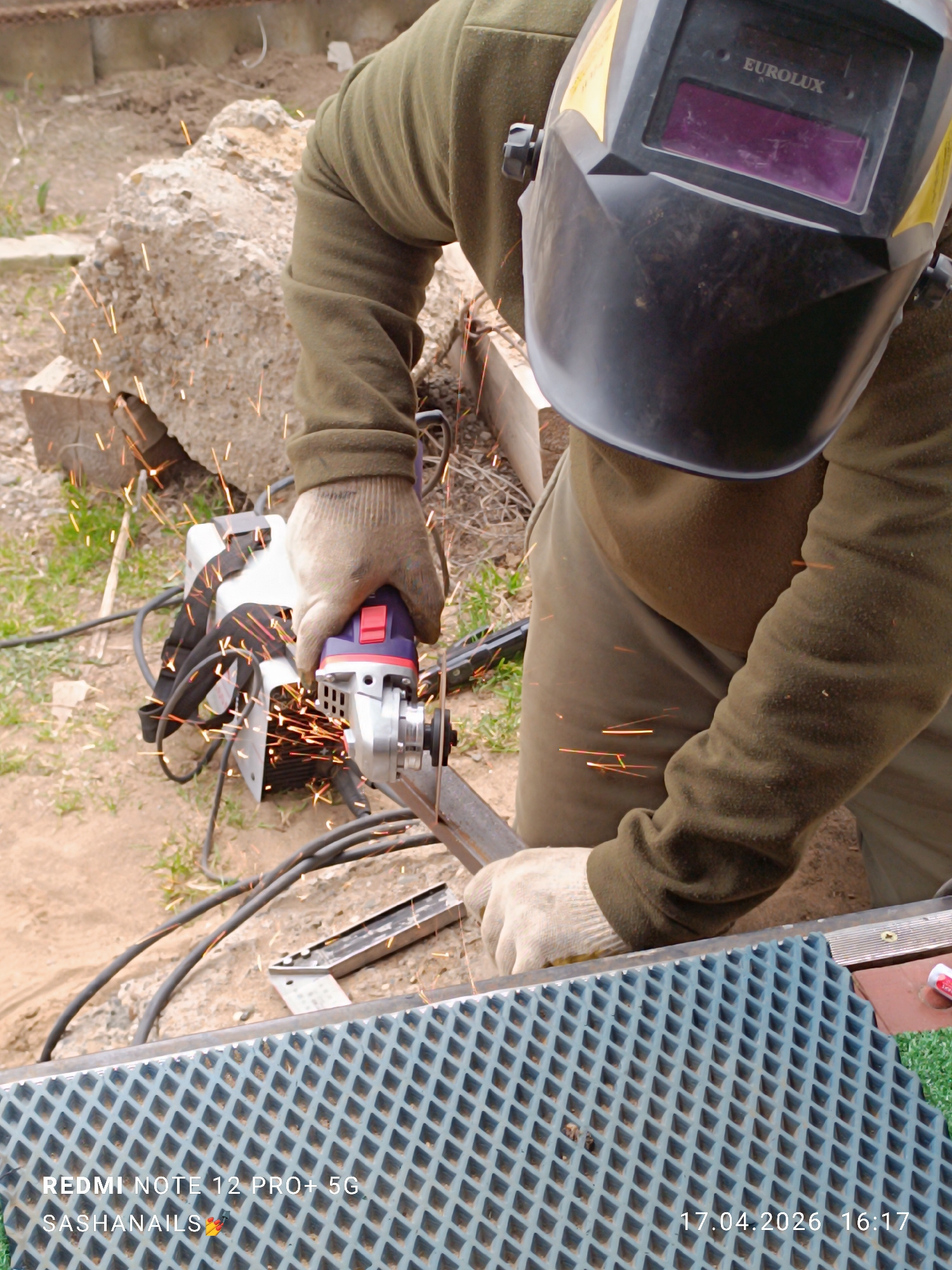 The image captures a person engaged in metalworking outdoors in Chaikovsky, Russia. The central subject, seen from the torso up, is wearing an olive-green long-sleeved top and light-colored work glove…read more