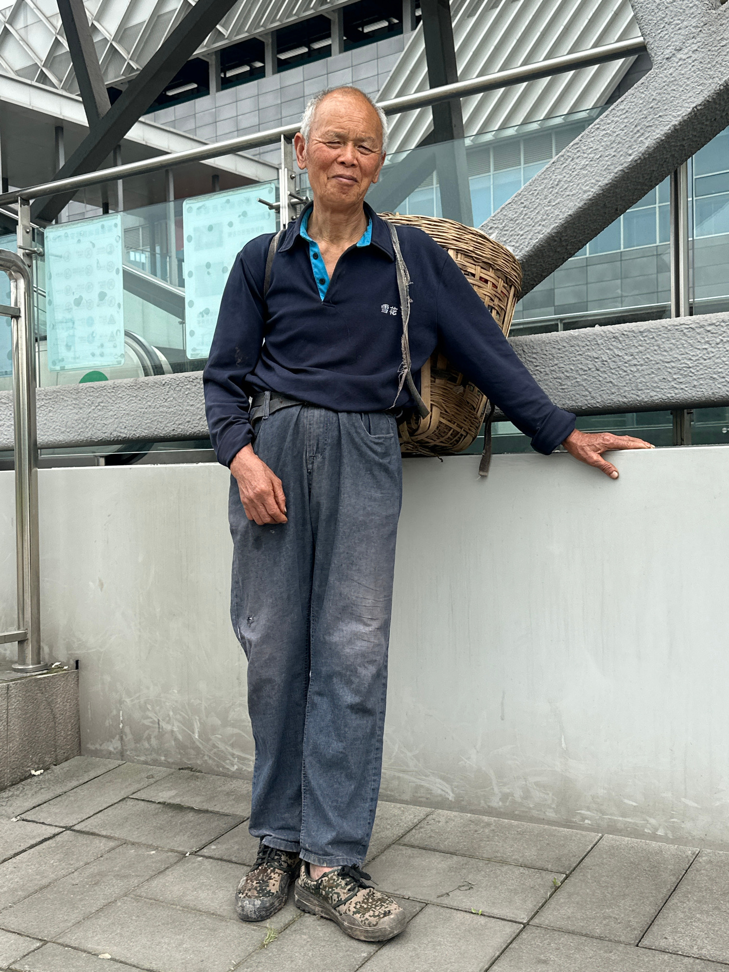 The image shows an elderly man in Jiangjin, China, wearing a dark blue long-sleeved shirt with a light blue collar, gray jeans, and camouflage-patterned sneakers. He has a woven basket strapped to his…read more