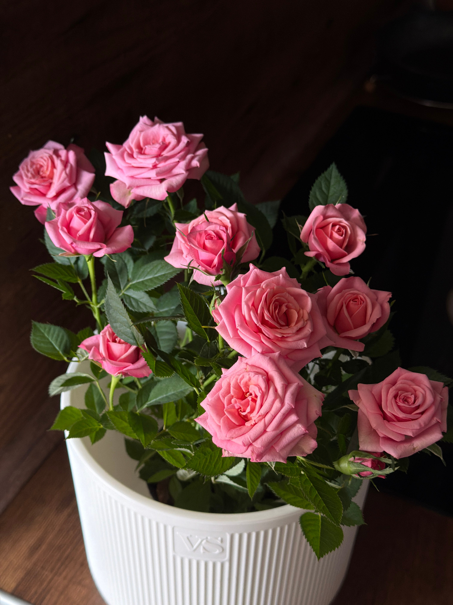 A high-angle shot depicts a cluster of pink roses with green foliage spilling out of a tilted white pot. The scene is set on a dark wooden surface, possibly a table, near a dark corner. The environmen…read more