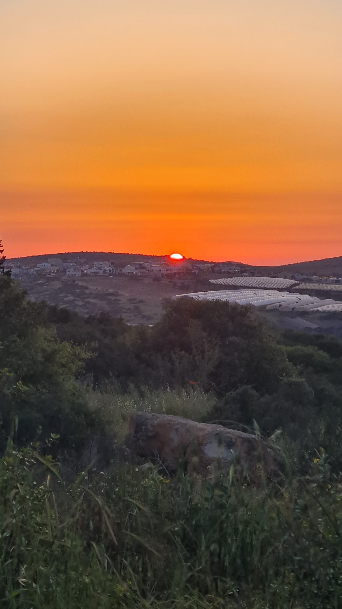 The image captures a sunset over what appears to be a semi-rural or developing area. On the right side, there is dense green foliage, possibly indicating a hillside or wooded area. A large rock or bou…read more