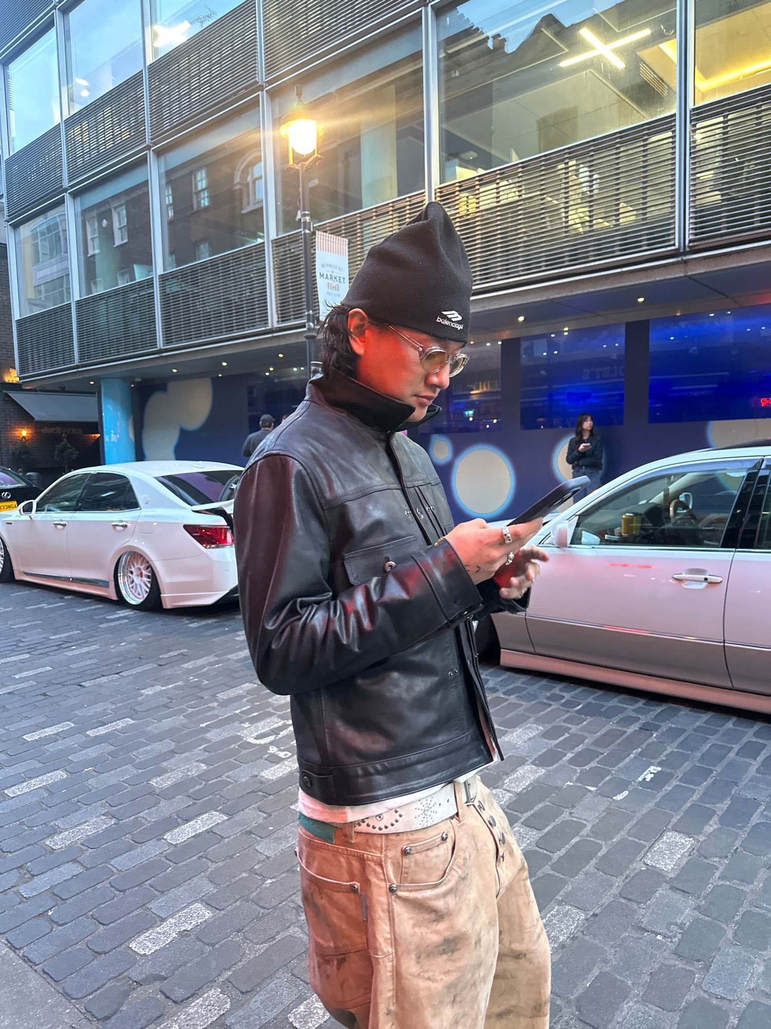 The image captures an urban street scene at what appears to be night or evening, indicated by the artificial lighting. The primary subject is a person, likely male, standing on a cobblestone street, e…read more