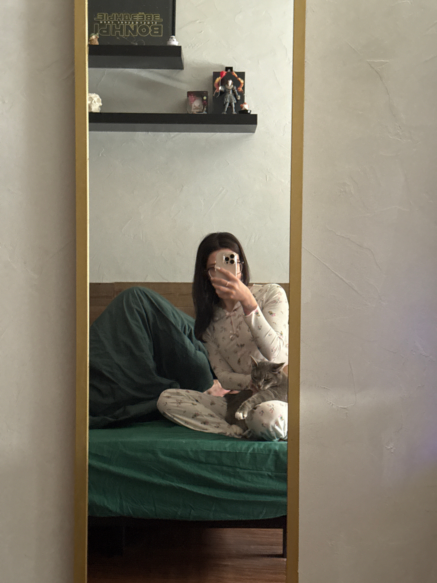 A mirror reflection shows a person holding a phone and a cat on a bed covered with a dark green blanket. The wall behind the bed is textured. A black shelving unit with various objects is visible on t…read more