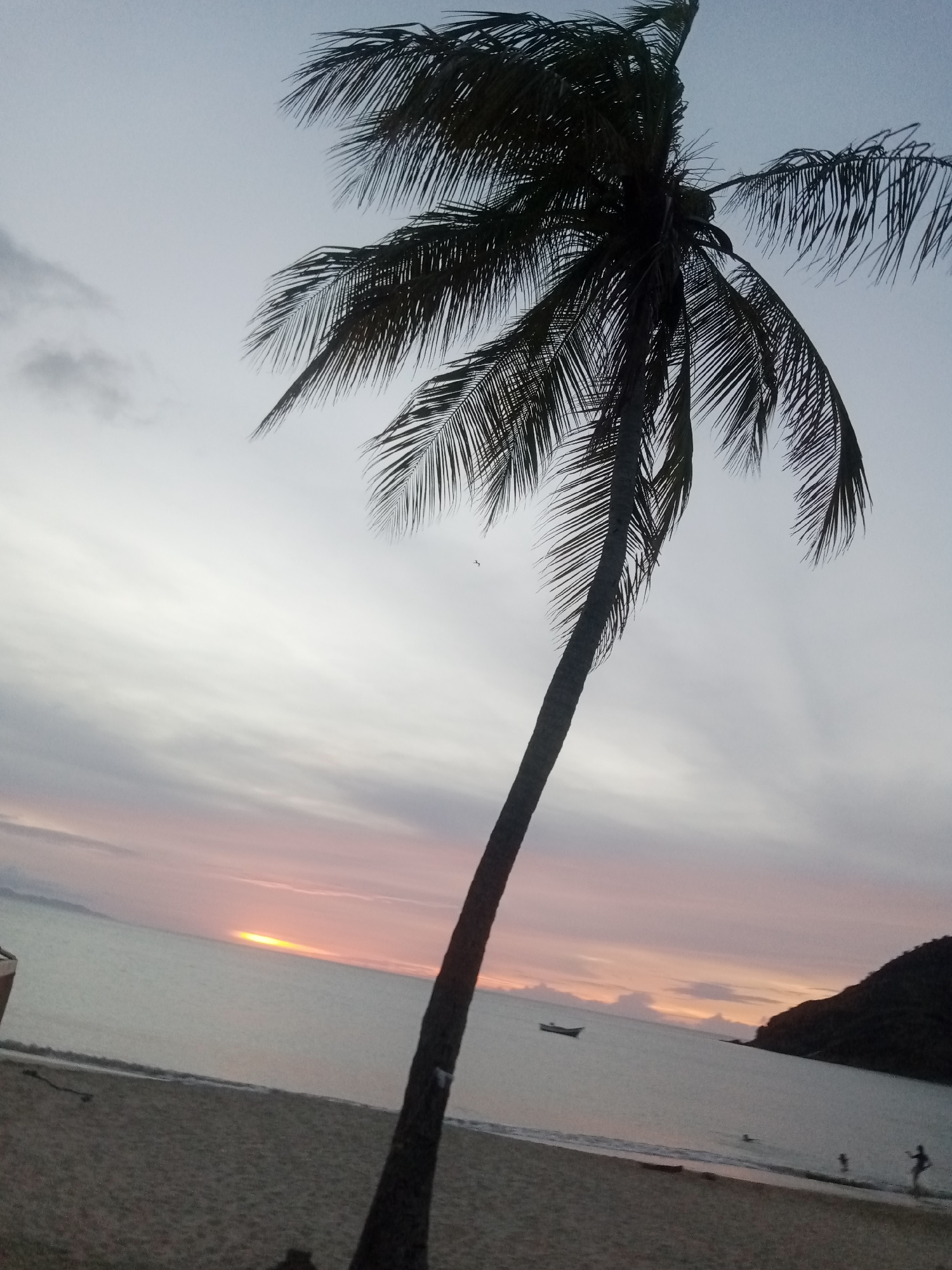 The image depicts a beach scene at sunset in Juan Griego, Venezuela. A tall palm tree is the dominant foreground feature, leaning diagonally across the frame. The sun is setting over the ocean, creati…read more