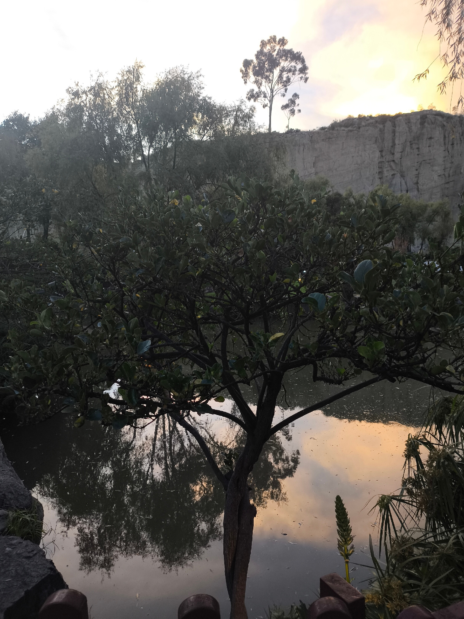 The photograph captures a pond reflecting the sky at sunset. In the foreground, a tree with a twisted trunk leans toward the water, its branches covered in green leaves. The reflection of the trees an…read more