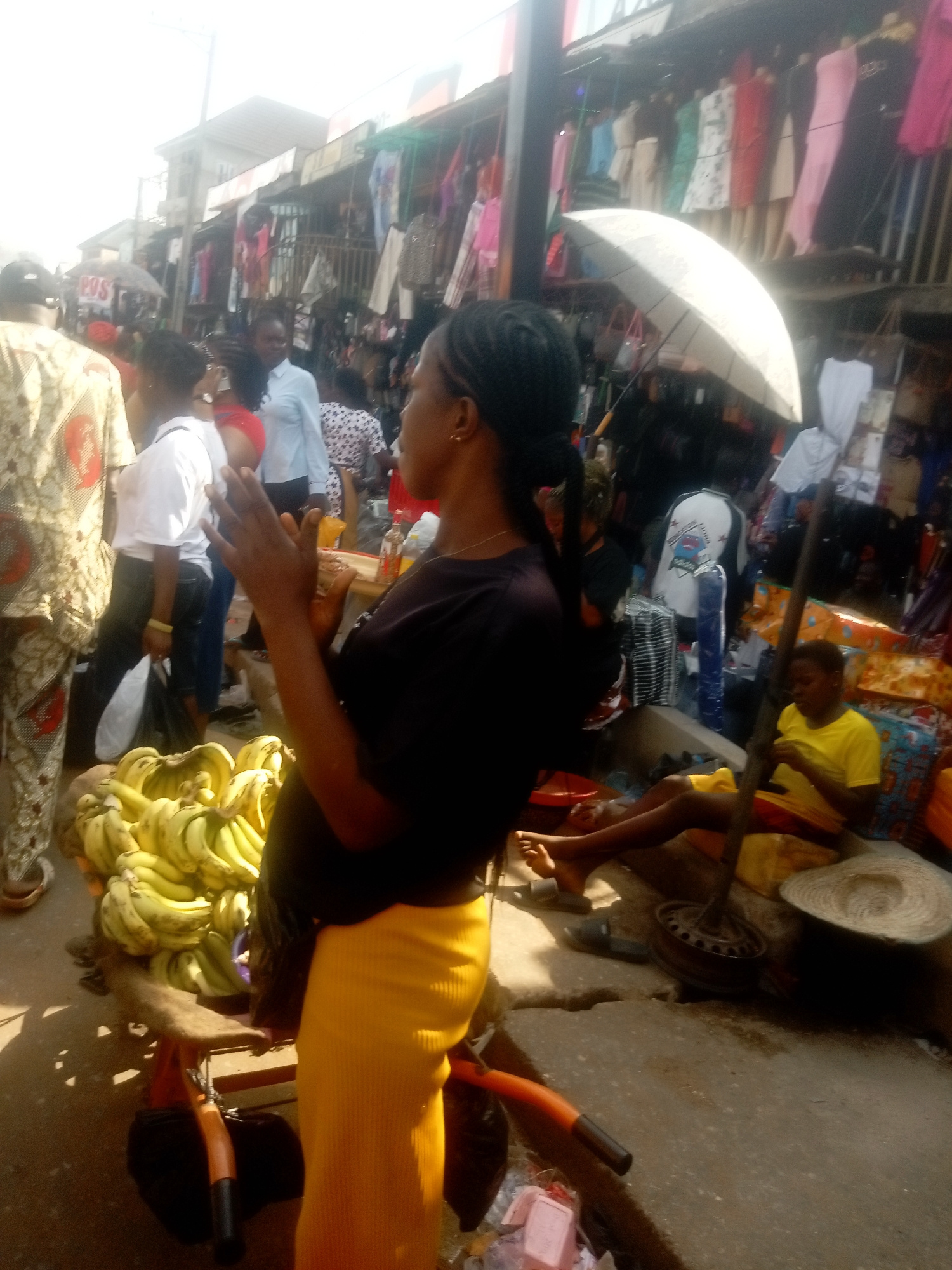 The image shows a bustling scene in a market in Awka, Nigeria. A woman with braided hair, wearing a black shirt and a yellow skirt, stands near a cart piled high with bananas. She is looking to her ri…read more