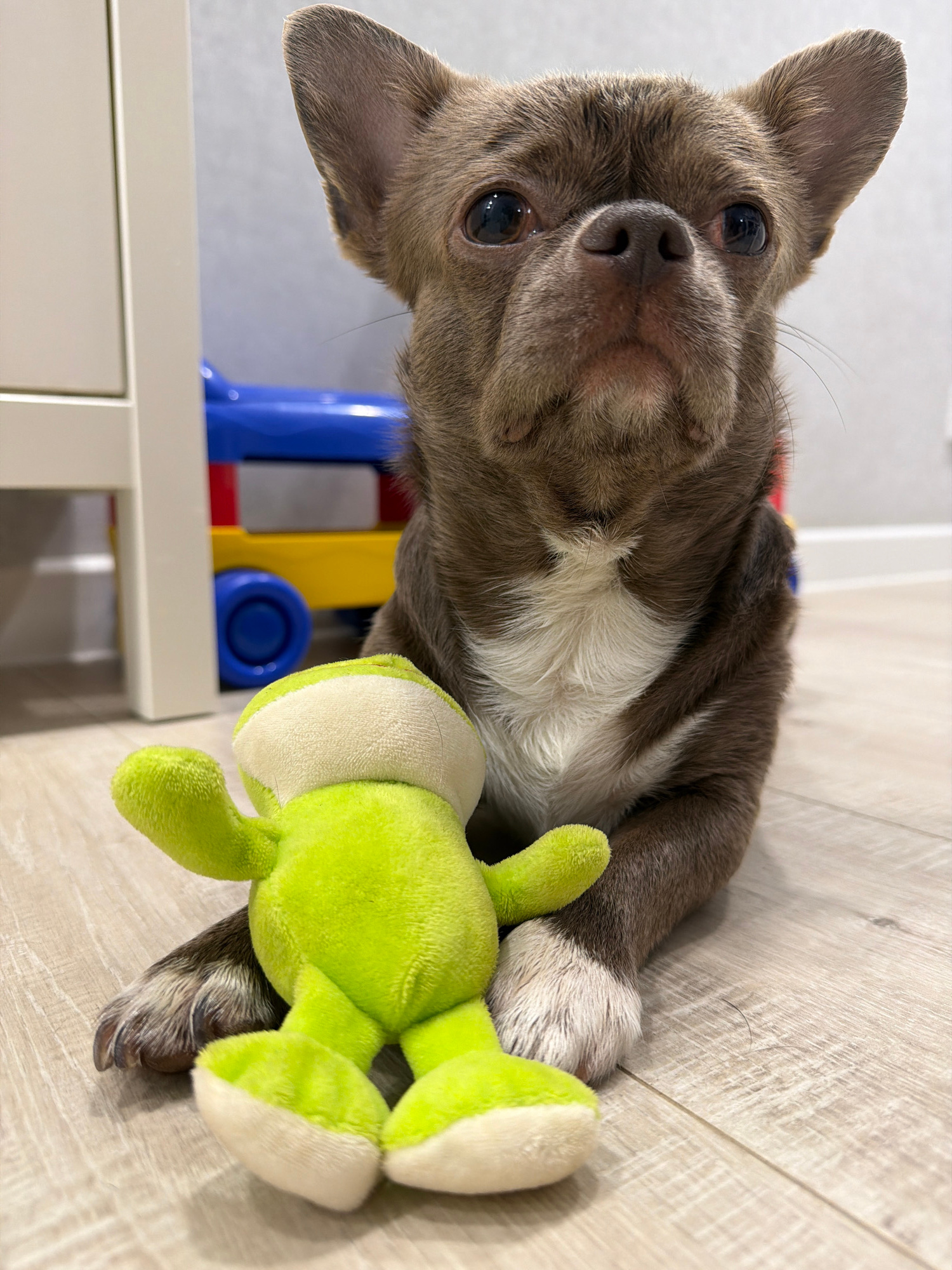 A small, brown and white Chihuahua-type dog is lying on a light-colored, wood-grain patterned floor. The dog is positioned with its head tilted towards the viewer and its body extended to the right. A…read more