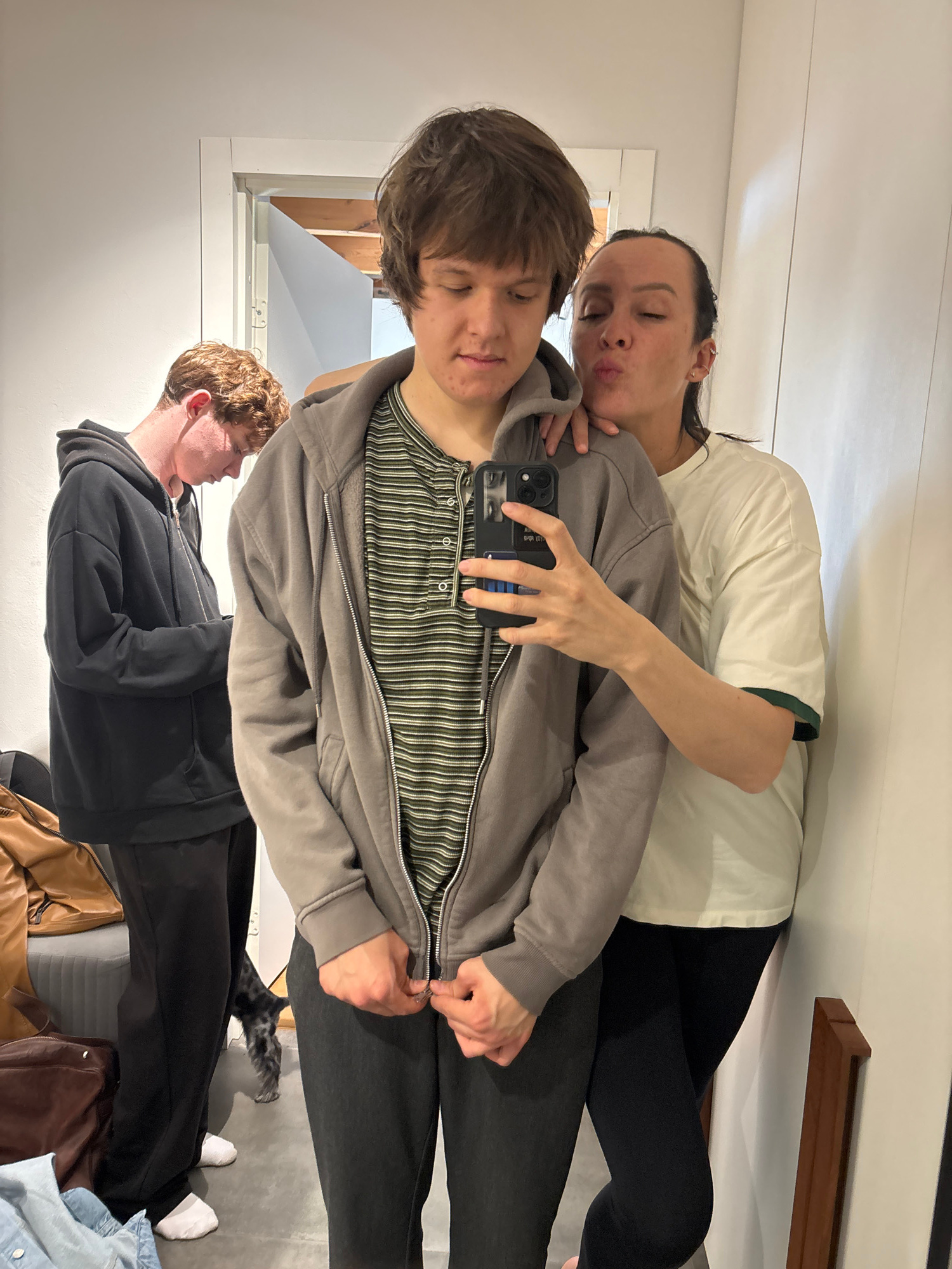 Three young individuals are captured in a vertical selfie indoors, facing a mirror. The person in the foreground, holding a dark-colored smartphone, has light brown hair and wears a grey zipped hoodie…read more