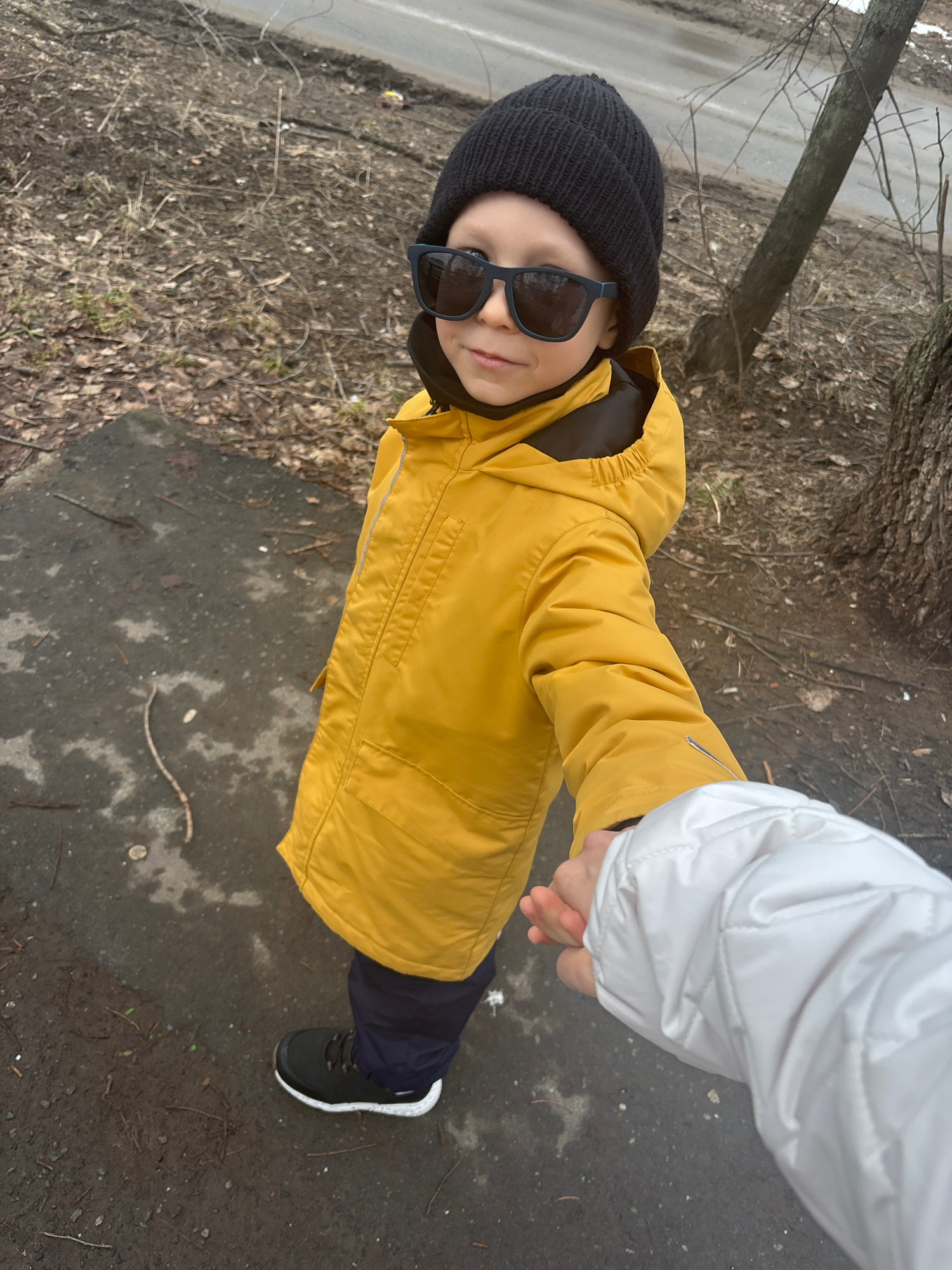 A child wearing a black beanie, sunglasses, a yellow jacket, and black pants with black and white sneakers stands on a weathered concrete surface adjacent to a patch of dry, brown vegetation. The chil…read more