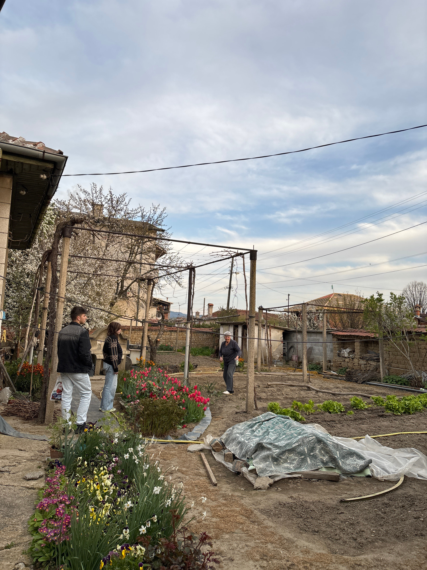 The image presents an outdoor scene in Banya, Bulgaria. Three people are visible in what appears to be a garden or backyard. One individual, wearing a dark suit, is leaning over near a row of garden v…read more