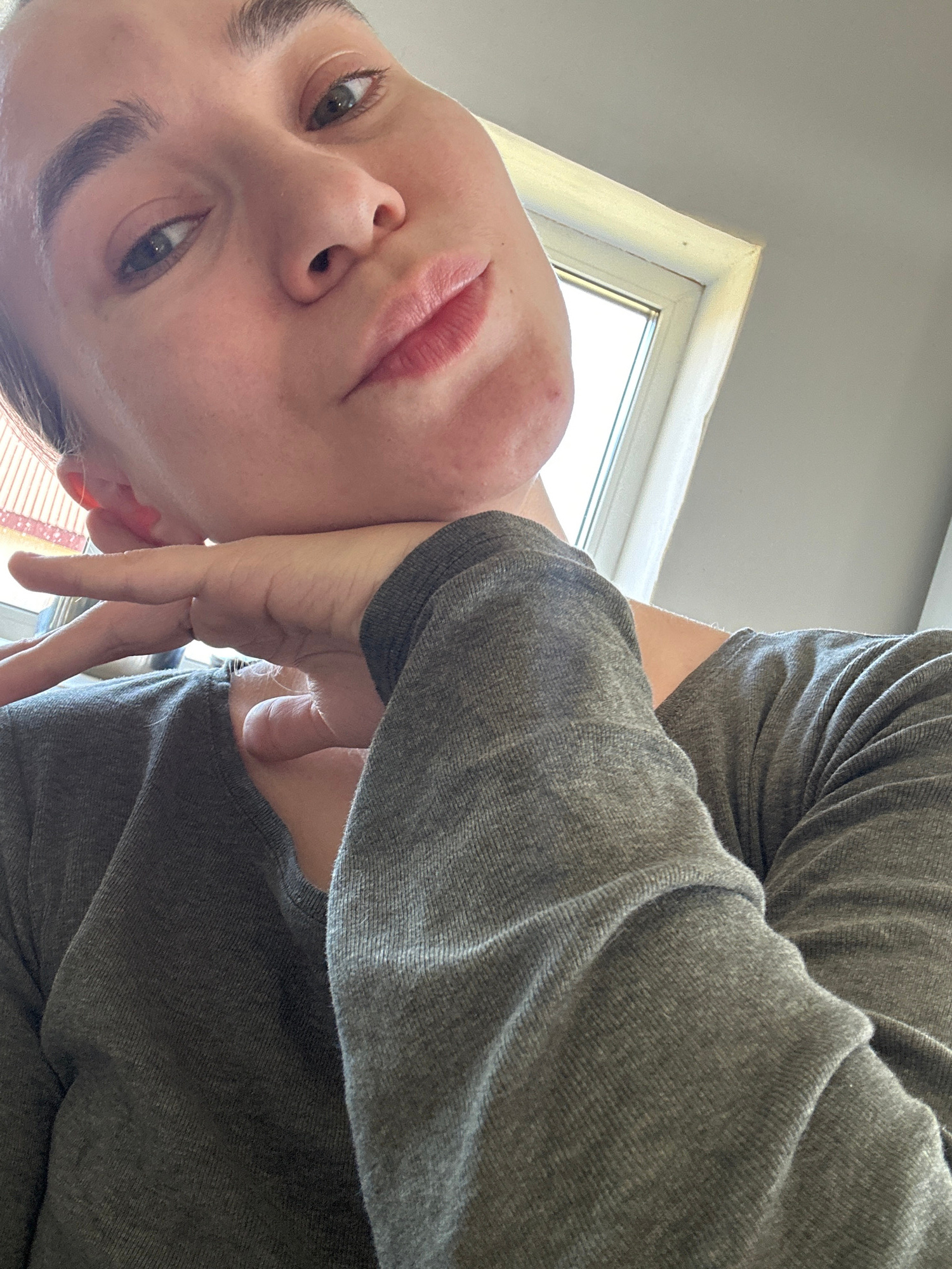 A selfie of a person with fair skin wearing a gray long-sleeved shirt. The person's head is tilted, positioning their face in the lower left corner of the frame. The background features a window frame…read more