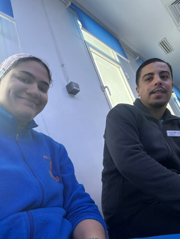Two individuals are seated indoors within an office or commercial establishment in Meknes, Morocco. The subject on the left is a female with dark hair, wearing a multi-colored headband and a blue fleeβ¦read more
