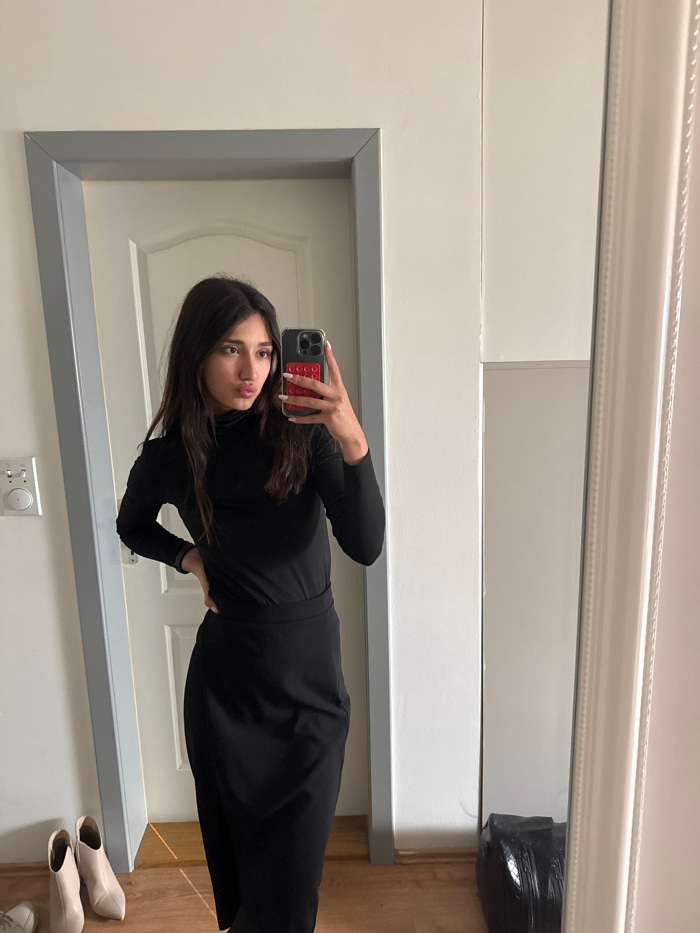 A female subject is depicted in a full-length mirror selfie, standing indoors. She has dark hair and is wearing a black long-sleeved turtleneck top and a black midi skirt. Her right hand holds a smart…read more
