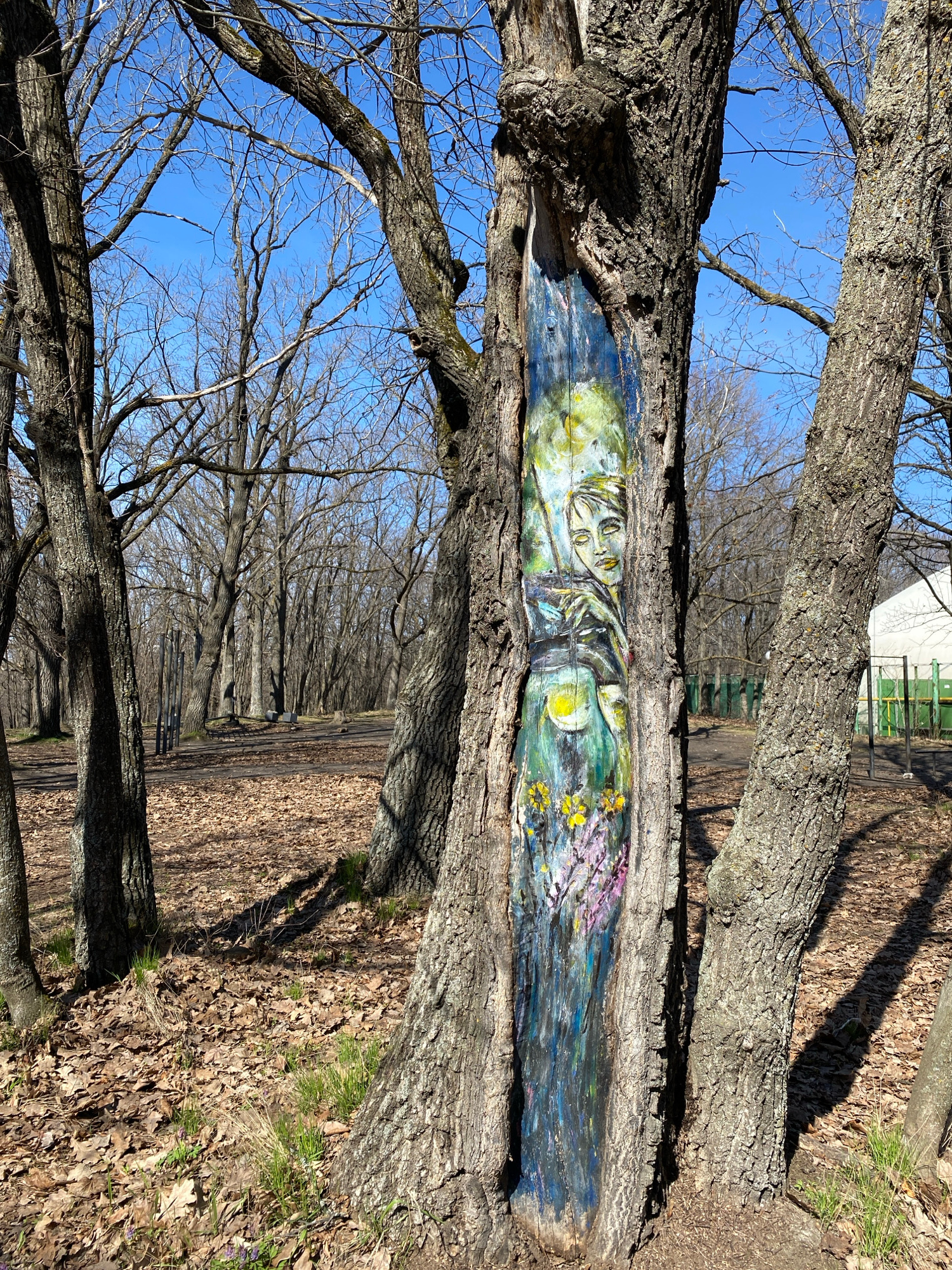 This image captures a vibrant outdoor scene on a clear, sunny day in Ulyanovsk, Russia. The primary subject is a large, mature tree trunk, which has an intricate piece of art carved or painted into a…read more