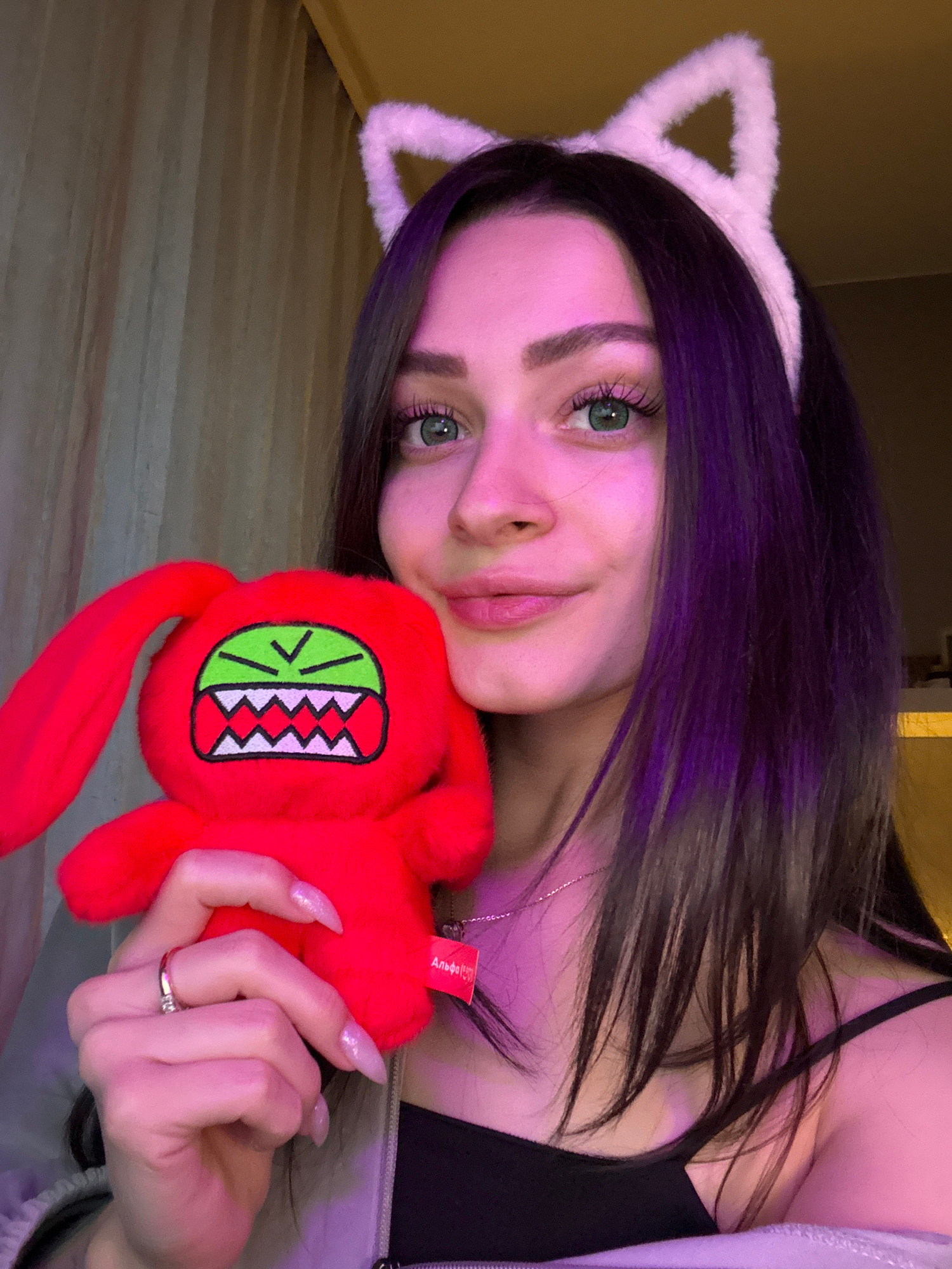 A young woman with long, dark hair tinted with purple at the roots, wearing fluffy white cat ears, is lying down and holding a red plush toy with a menacing grin. Her eyes are green and she has long e…read more