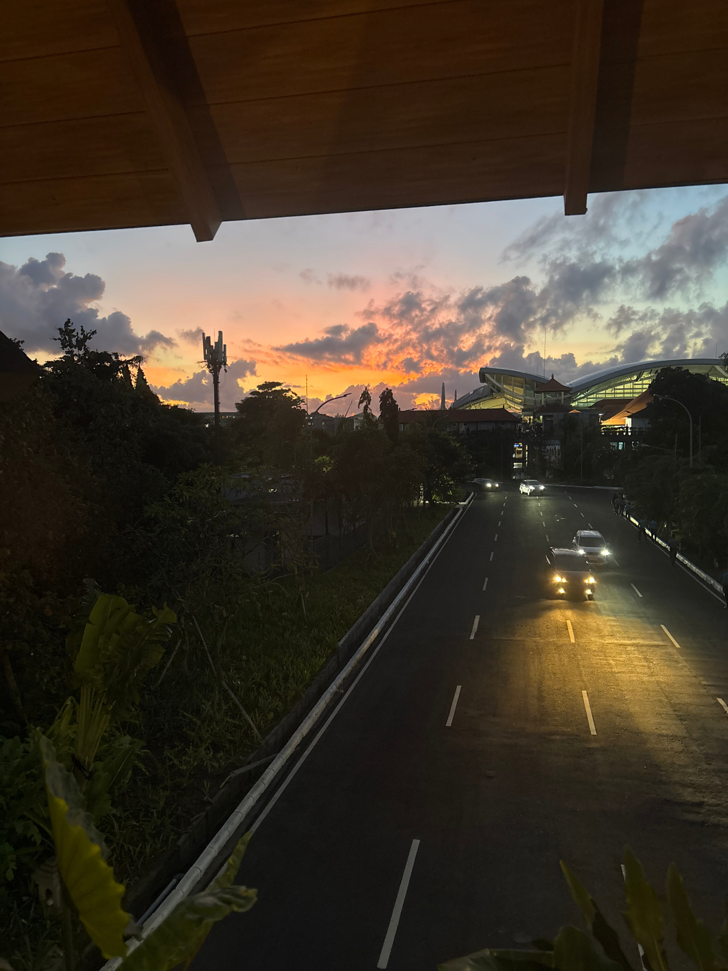 The image depicts a dusk scene overlooking a road in Kuta, Indonesia. The sky is a mix of colors, from blue and gray to orange and pink, reflecting the setting sun behind a cloud cover. A building wit…read more