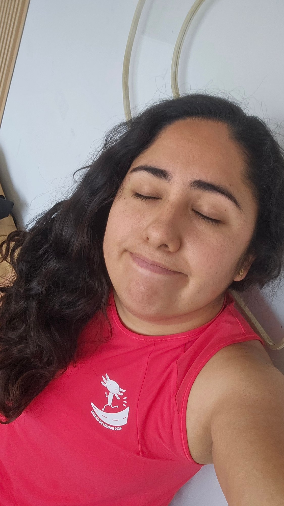 A young woman with dark curly hair is lying on a white surface. She is wearing a red t-shirt with a white logo on the upper left chest of a goat on a moon with the words "Ciudad de Mexico 2026". Her eā¦read more