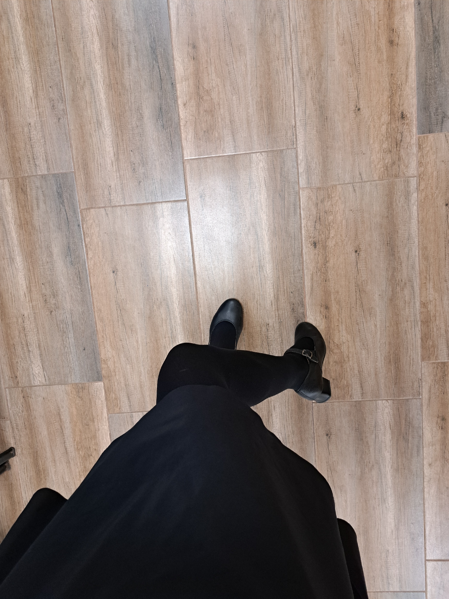 The image displays a high-angle view of a person's lower legs and feet against an indoor floor. The person is wearing black tights or stockings, paired with black shoes featuring a mary jane style str…read more