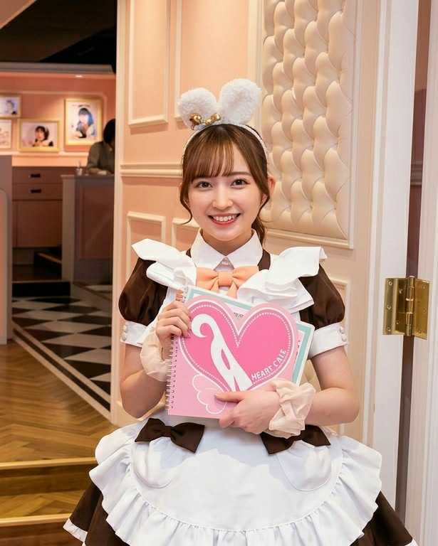 A smiling young woman in a brown and white maid costume with bunny ears holds a pink notebook with a white heart and the words "Heart Cafe." She stands in front of a doorway with a checkerboard floor…read more