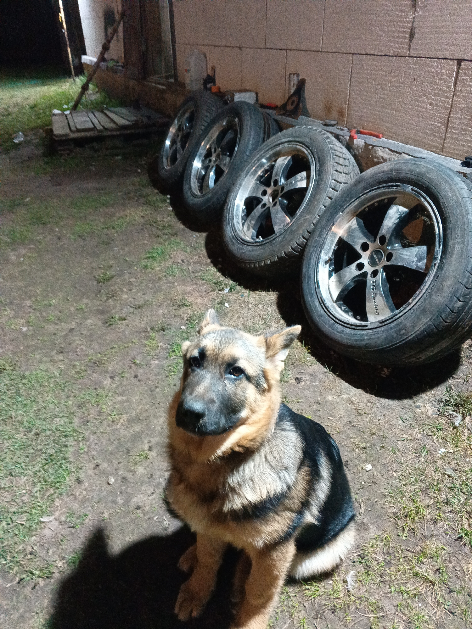 This image depicts an outdoor scene at night or dusk, illuminated by an artificial light source that casts prominent shadows. In the foreground, a German Shepherd dog sits calmly on a patch of dirt an…read more