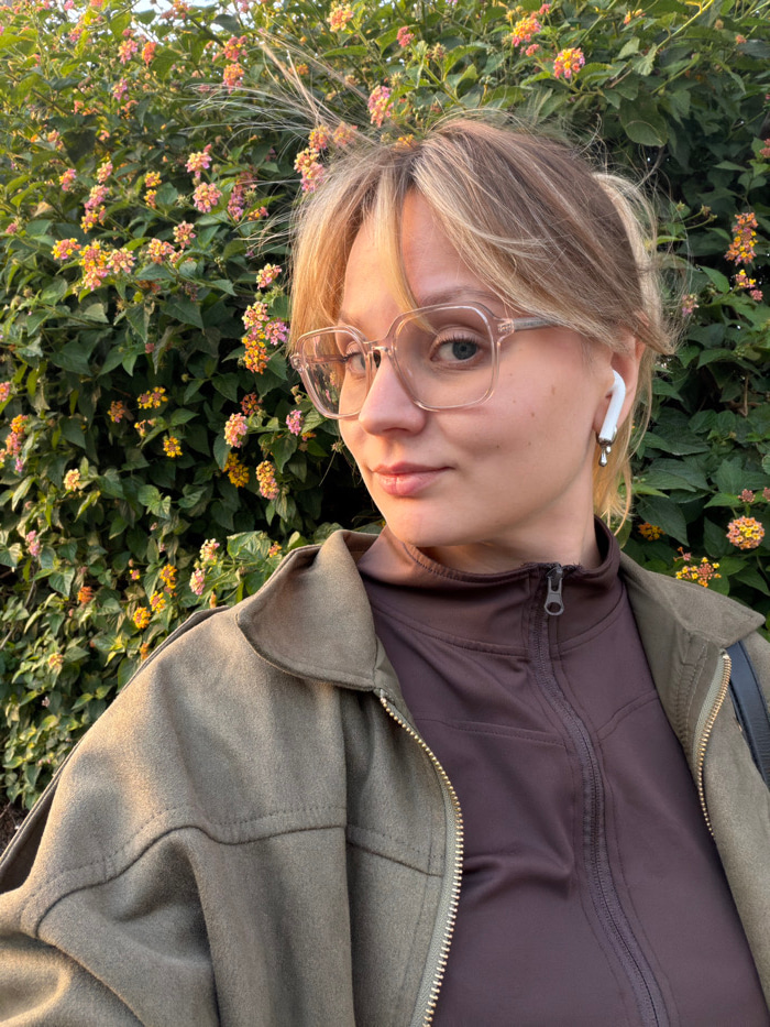 A close-up photograph captures an individual, appearing female, positioned slightly off-center to the right. She has fair skin, light brown hair with blonde highlights styled with bangs and pulled bac…read more