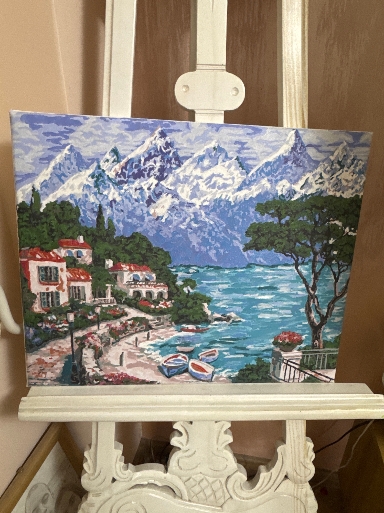 A painting depicting a coastal scene is propped up on a white easel. The painting portrays a coastline with houses nestled among trees, blue water with boats, and a rocky shore. The style of the paintβ¦read more