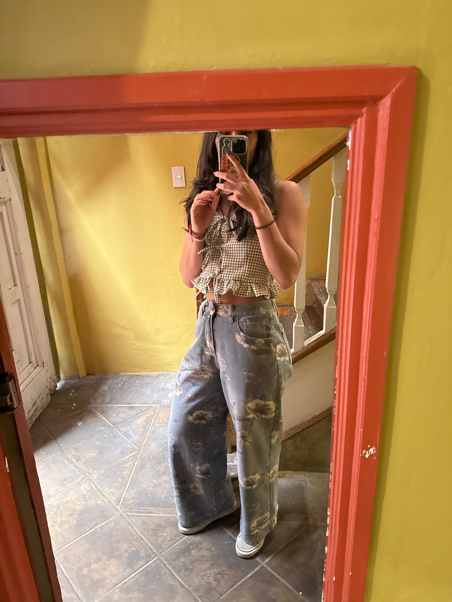 A mirror selfie depicts a person indoors in Mexico City, Mexico. The person, of indeterminate gender, wears a brown and white checkered top and floral print pants. They are holding a cell phone, takin…read more
