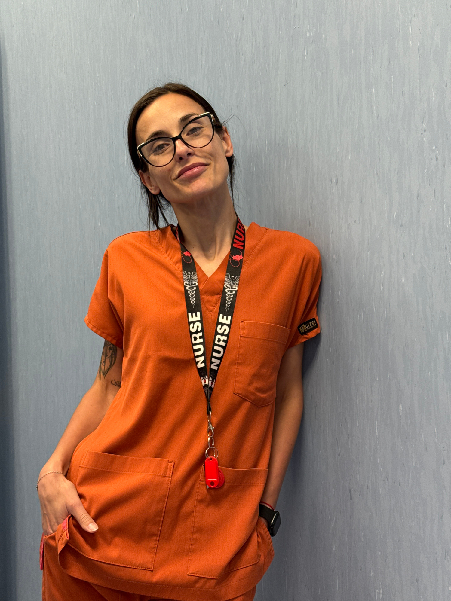 A woman wearing an orange medical uniform with a "NURSE" lanyard is shown indoors. The background appears to be a gray wall. Her face is clearly visible, and she is wearing glasses. She is standing wi…read more
