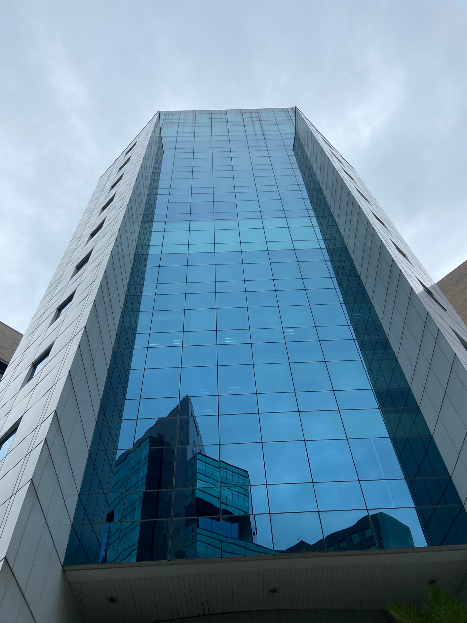 A modern, multi-story building dominates the frame, captured with a tilted perspective that gives the structure a dynamic, upward-stretching appearance against an overcast sky. The building features a…read more