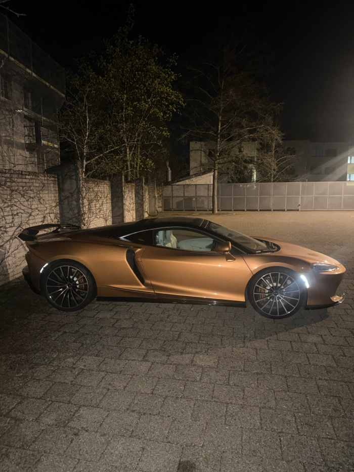A metallic copper/bronze McLaren GT, featuring a black roof and light-colored interior, is parked facing right, displaying its left profile, on a paved surface composed of grey interlocking pavers. Thβ¦read more