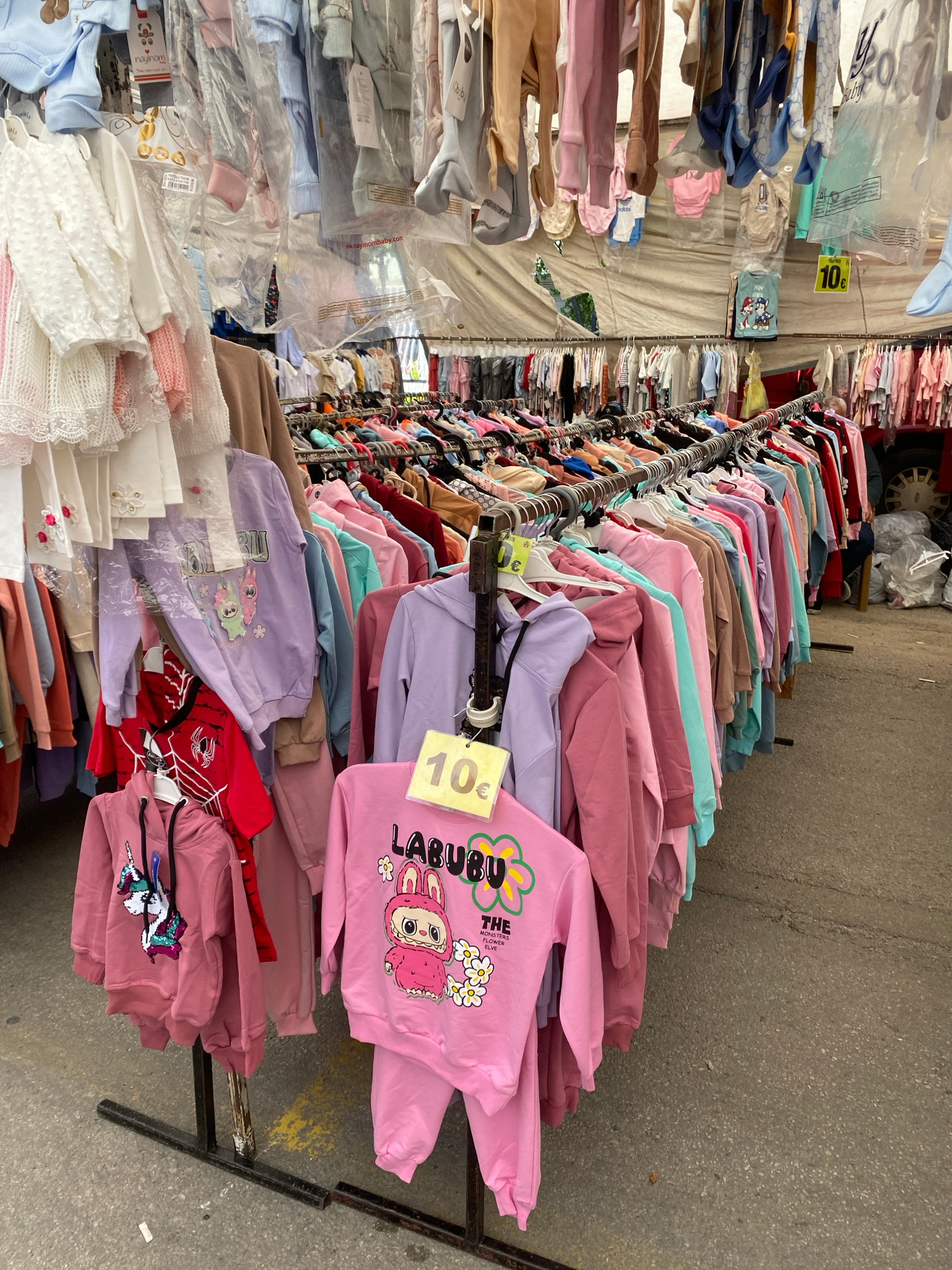 This image depicts a clothing market in Alanya, Turkey. Racks of garments, primarily children's wear, are arranged in rows. Clothes are various colors, including pink, purple, brown, and blue. Price t…read more